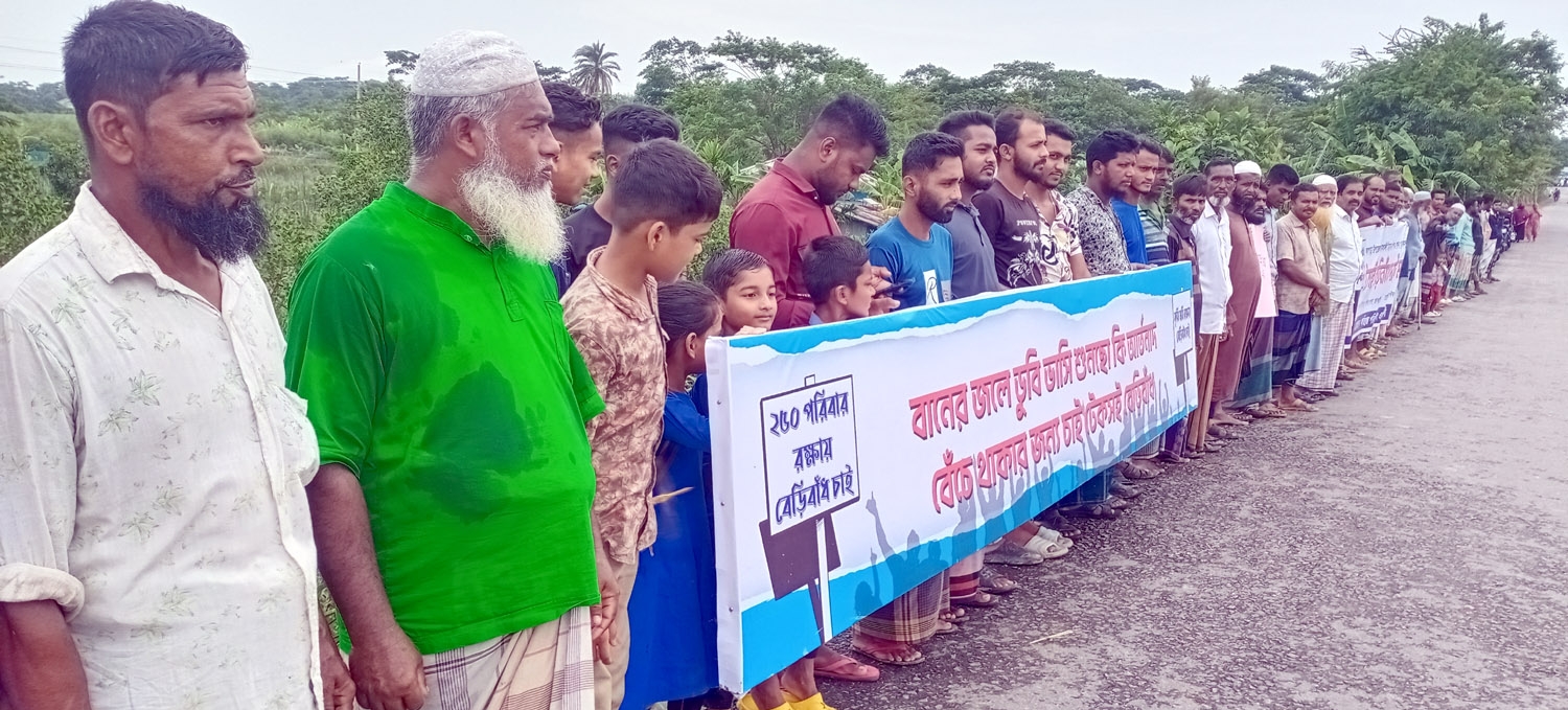 আপন নিউজ অফিসঃ অস্বাভাবিক জোয়ারের প্লাবন থেকে বাড়ি-ঘর, চলাচলের রাস্তাঘাট, জনপদ রক্ষায় টেকসই বেড়িবাঁধ নির্মাণের দাবিতে টিয়াখালী লোন্দা ব্রিজের সংযোগ সড়কে মানববন্ধন সমাবেশ করা হয়েছে। সোমবার সকাল দশটায় সেখানকার বাসিন্দা আড়াই শ’ পরিবারের নারী-পুরুষ মানববন্ধন করেন।