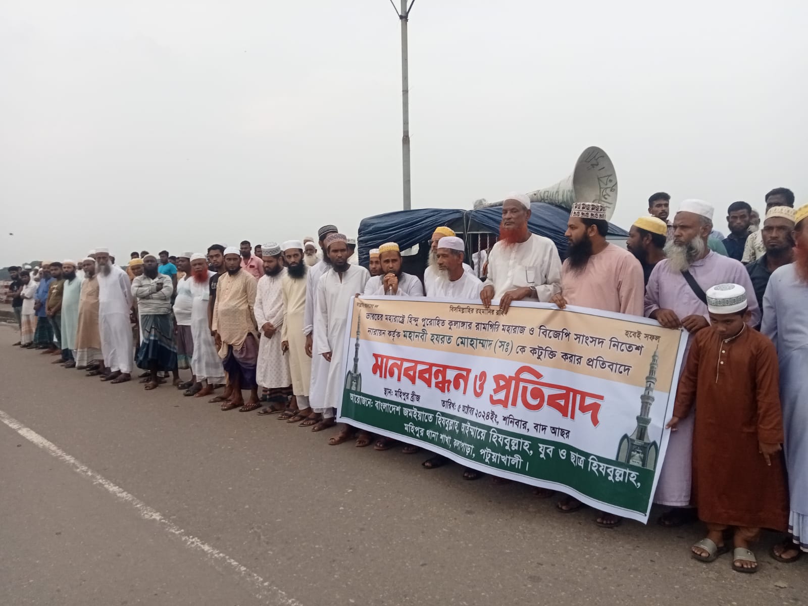 আপন নিউজ অফিসঃ মহিপুর ভারতের মহারাষ্ট্রে হিন্দু পুরোহিত কুলাঙ্গার রামগিরি মহারাজ ও বিজেপির সাংসদ নীতেশ নারায়ণ কর্তৃক মহানবী হযরত মুহাম্মদ (সাঃ) কে কটুক্তি করার প্রতিবাদে মানববন্ধন ও সমাবেশ অনুষ্ঠিত হয়েছে। শনিবার আছর নামাজ বাদ বাংলাদেশ জমইয়াতে হিজবুল্লাহ মহিপুর থানা শাখার উদ্যোগ মৎস্য বন্দর আলীপুর-মহিপুর শিববাড়িয়া নদীর ব্রীজের উপর এ মানববন্ধন ও প্রতিবাদ সভা অনুষ্ঠিত হয়।