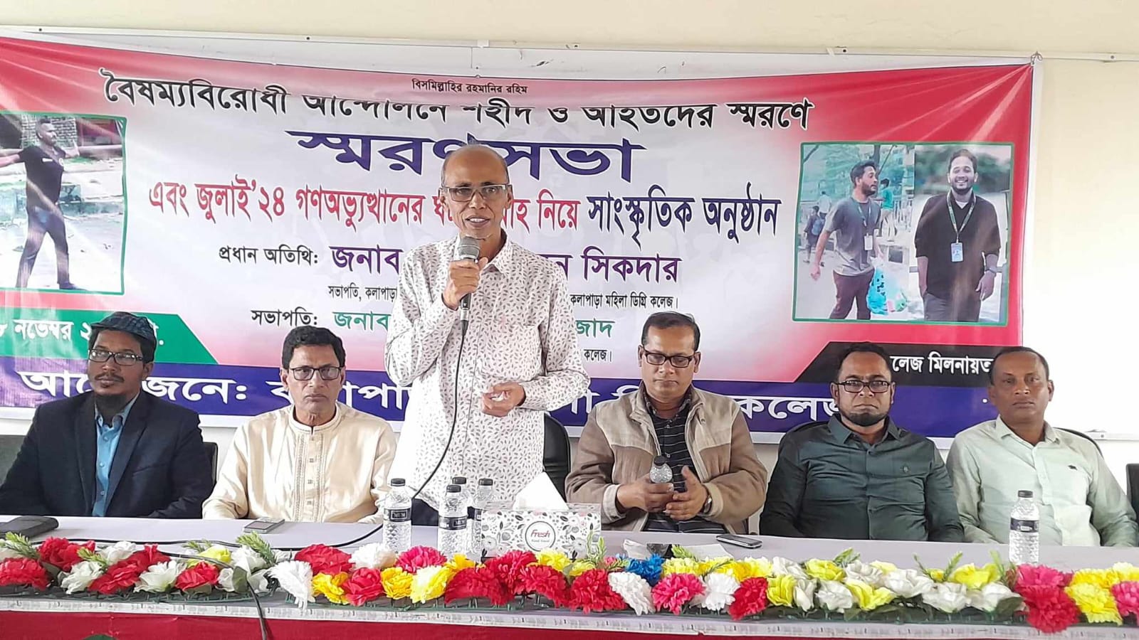 বৃহস্পতিবার দুপুর এ উপলক্ষে কলেজের শিক্ষক মিলনায়তনে আয়োজিত অনুষ্ঠানে সভাপতিত্ব করেন কলেজের ভারপ্রাপ্ত অধ্যক্ষ আবুল কালাম আজাদ। এতে প্রধান অতিথি হিসেবে উপস্থিত থেকে বক্তব্য রাখেন কলাপাড়া উপজেলা বিএনপির সভাপতি হাজী হুমায়ুন সিকদার। এতে বিশেষ অতিথির বক্তব্য রাখেন কলাপাড়া পৌর বিএনপির সভাপতি গাজী মোহাম্মদ ফারুক, উপজেলা বিএনপির সাংগঠনিক সম্পাদক অ্যাডভোকেট খন্দকার নাসির উদ্দিন, উপজেলা বিএনপির সাংগঠনিক সম্পাদক সেলিম সিকদার প্রমুখ নেতৃবৃন্দ।
