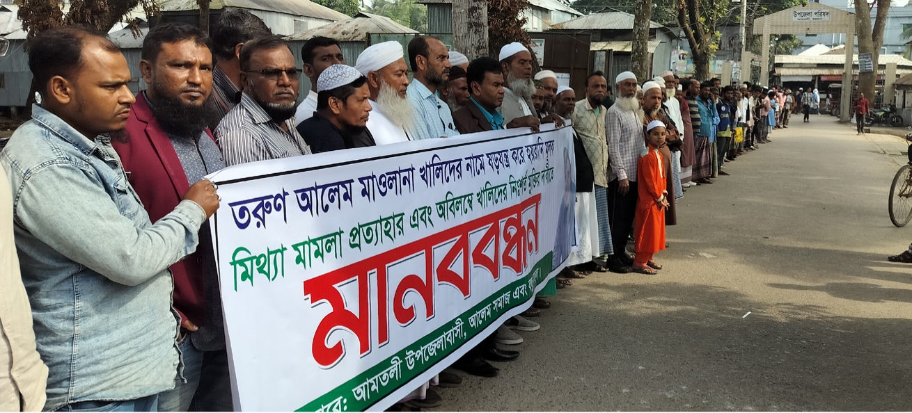 এ হয়রানীমুলক মিথ্যা মামলা প্রত্যাহার ও মাওলানা খালেদ গাজীকে মুক্তির দাবীতে বৃহস্পতিবার আমতলী উপজেলা পরিষদ প্রাঙ্গণে মানববন্ধন করা হয়েছে। হারুন মোল্লার সভাপতিত্বে মানববন্ধনে বক্তব্য রাখেন ব্যবসায়ী জাকির হাওলাদার, বদিউল আলম মুন্সি, মান্নান গাজী ও ছালাম মুন্সি প্রমুখ। মানববন্ধনে বক্তারা হয়রানীমুলক মিথ্যা মামলা প্রত্যাহার ও মাওলানা খালিদ গাজীর মুক্তি দাবী জানান।