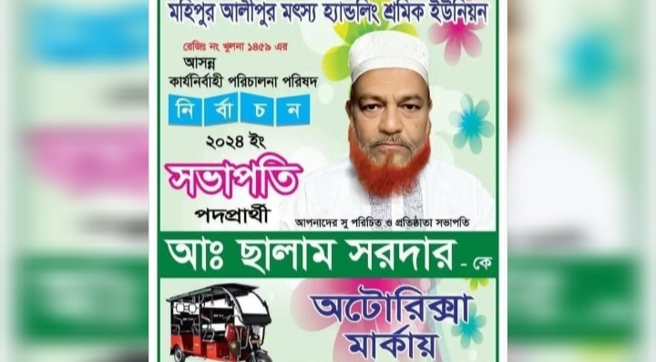 তার ছোট জামাই মোঃ রিপন সরদার বলেন, আমার শ্বশুর সালাম সরদার মহিপুর আলীপুর মৎস্য হ্যান্ডলিং শ্রমিক ইউনিয়নের প্রতিষ্ঠাতা সভাপতি, এবারের নির্বাচনে তিনি জয়ী হওয়ার সম্ভাবনা বেশি, আমি মহিপুর আলীপুর মৎস্য হ্যান্ডলিং শ্রমিক ইউনিয়নের সকল সম্মানিত ভোটারদের কাছে ভোট প্রার্থনা করছি।