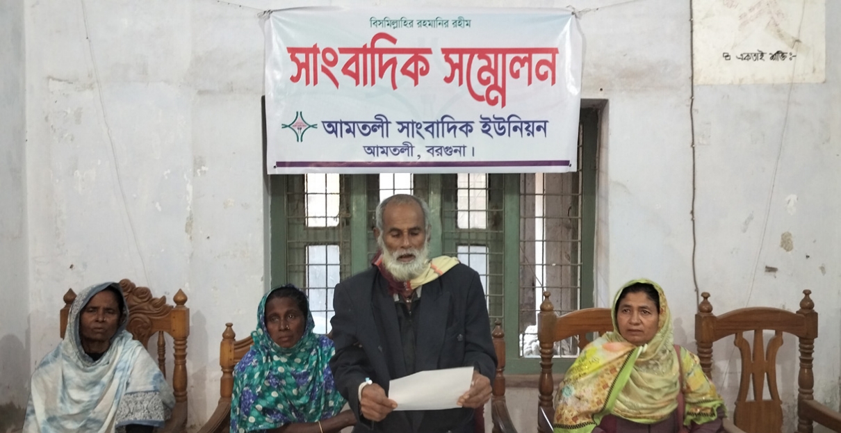 সংবাদ সম্মেলনে লিখিত বক্তব্যে মোঃ সেলিম বলেন, আমতলী উপজেলার আড়পাঙ্গাশিয়া ইউনিয়নের ঘোপখালী মৌজায় আমার ৯.২০ একর জমি মোঃ সোহাগ তালুকদার, এরশাদ তালুকদার, তোফাজ্জেল তালুকদার, জাহাঙ্গির তালুকদার, বাবুল হোসেন , বাছির তালুকদার ও ইউসুফ আকন জোরপুর্বক ভোগদখল করে আসছে। আমি এ বিরোধীয় জমির বিরুদ্ধে নির্বাহী ম্যাজিস্ট্রেট আদালতে মামলা দায়ের করেছি। আদালতের বিচারক মুহাম্মদ আশরাফুল আলম মামলাটি আমলে নিয়ে ওই জমির ওপর বিবাদীদের প্রবেশ নিষেধাজ্ঞা জাড়ি করেন। কিন্তু বিবাদীগত আদালতের নিষেধাজ্ঞা অমান্য করে গত ১৭ ডিসেম্বর (মঙ্গলবার) ওই বিরোধীয় জমির ধান কর্তণ করে নিয়ে যায়। আমি হতদরিদ্র মানুষ ধান কর্তণে বাঁধা দিতে পারিনি। গত ১৮ ডিসেম্বর আমি আমতলী থানায় অভিযোগ দিতে যাওয়ার পথে আমাকে বিবাধীরা ও তাদের সন্ত্রাসী বাহিনী আব্দুল লতিফ গাজী, সুলতান আহমেদ, সেরাজ উদ্দিন গাজী ও আলতাফ মীর আমাকে তুলে নেয়। পরে তারা লোহার রড় দিয়ে পিটিয়ে আমার কোমড়ে গুরুতর জখম করেছে। পরে তারা আমাকে ফেলে রেখে চলে যায়। ওই সময় তারা এ বিষয় নিয়ে থানায় মামলা করলে আমাকে খুন এবং আমার পরিবারের নারী সদস্যদের র্ধষণ ও এসিড মেরে জলসে দেয়ার হুমকি দিয়ে চলে যায়। পরে আমাকে স্থানীয়রা উদ্ধার করে আমতলী উপজেলা স্বাস্থ্য কমপ্লেক্সে নিয়ে যায়। ওই হাসপাতালে আমি চিকিৎসাধীন আছি। তিনি আরো বলেন, সন্ত্রাসীদের ভয়ে আমি পরিবারসহ পালিয়ে বেড়াচ্ছি। বাড়ীতে যেতে পারছি না। থানায় অভিযোগ দেয়ার সাহস পাচ্ছি না। পুলিশ প্রশাসনে কাছে এদের বিরুদ্ধে দ্রæত ব্যবস্থা নেয়ার দাবী জানান তিনি। সংবাদ সম্মেলনে আরো উপস্থিত ছিলেন কহিনুর বেগম, মরিয়ম বেগম ও সীমা আক্তার।