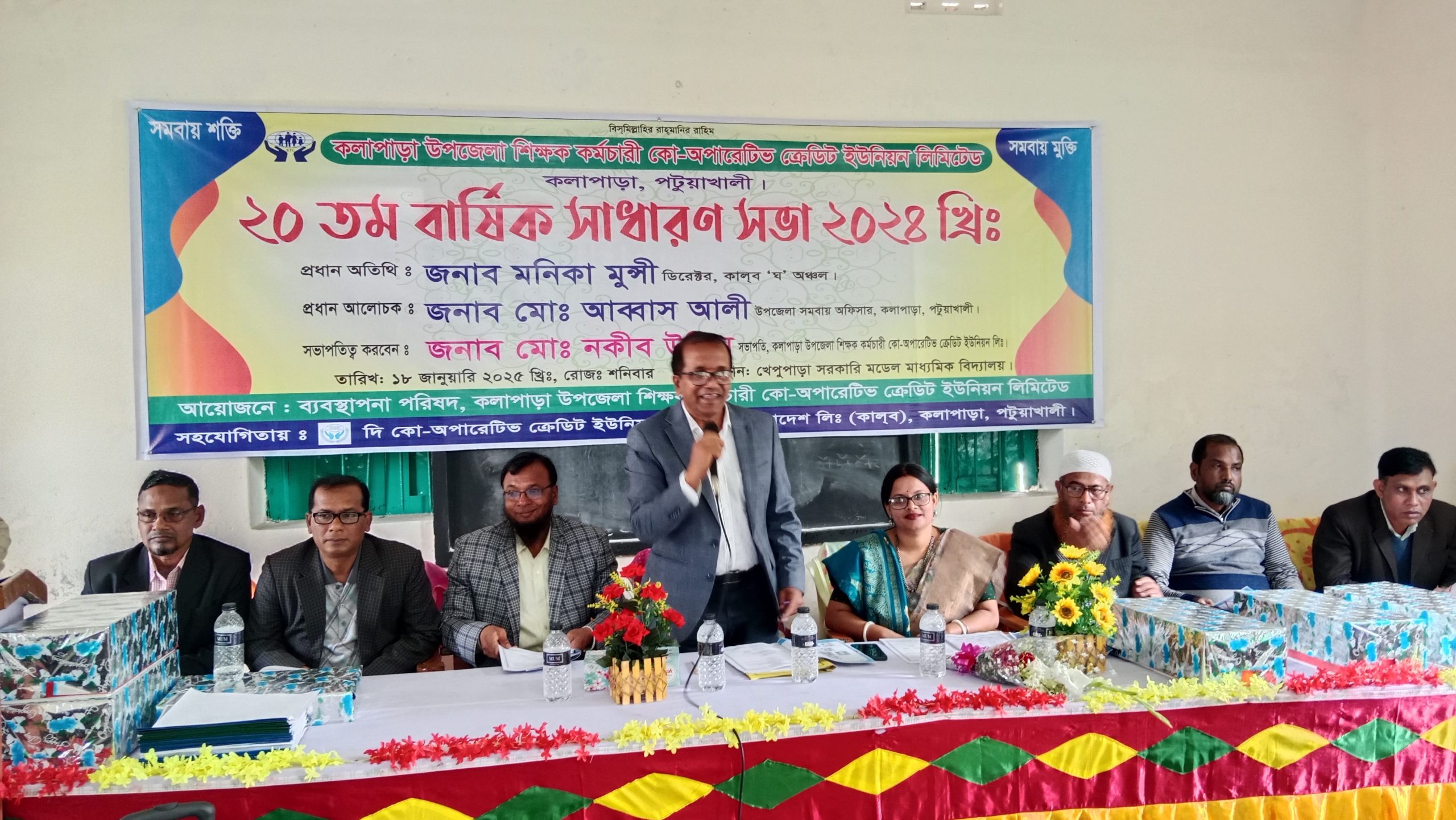 বিশ্বাস শিহাব পারভেজ মিঠুঃ কলাপাড়া উপজেলা শিক্ষক কর্মচারী কো-অপারেটিভ ক্রেডিট ইউনিয়ন লিমিটেডের ২০ তম বার্ষিক সাধারণ সভা ২০২৪ অনুষ্ঠিত হয়েছে। সমিতির ব্যবস্থাপনা পরিষদের আয়োজনে, দি-কো-অপারেটিভ ক্রেডিট ইউনিয়ন লীগ অব বাংলাদেশ লিমিটেড(কালব)'র সহযোগিতায় শনিবার(১৮ জানুয়ারি) সকাল দশটায় খেপুপাড়া সরকারি মডেল মাধ্যমিক বিদ্যালয় মিলনায়তনে এ সভা অনুষ্ঠিত হয়। সমিতির সভাপতি মো. নকিব উদ্দিনের সভাপতিত্বে সভায় প্রধান অতিথি হিসেবে উপস্থিত ছিলেন কালব "ঘ" অঞ্চলের ডিরেক্টর মনিকা মুন্সী। প্রধান আলোচক হিসেবে উপস্থিত ছিলেন উপজেলা সমবায় অফিসার মো. আব্বাস আলী। বিশেষ অতিথি হিসেবে উপস্থিত ছিলেন, জেলা ব্যাবস্থাপক মো.আবদুর রউফ, সাবেক বোর্ড সভাপতি মো.ইউসুফ আলী, খেপুপাড়া সরকারি মডেল মাধ্যমিক বিদ্যালয়ের প্রধান শিক্ষক (ভারপ্রাপ্ত) মো.আবদুর রহিম, কলাপাড়া মহিলা কলেজ'র অধ্যক্ষ মো.আবুল কালাম আজাদ, কালব কর্মকর্তাবৃন্দ, বর্তমান ও সাবেক কার্যকরী পরিষদের সদস্যবৃন্দ এবং উপজেলার বিভিন্ন শিক্ষা প্রতিষ্ঠানের শিক্ষক ও কর্মচারীবৃন্দ।