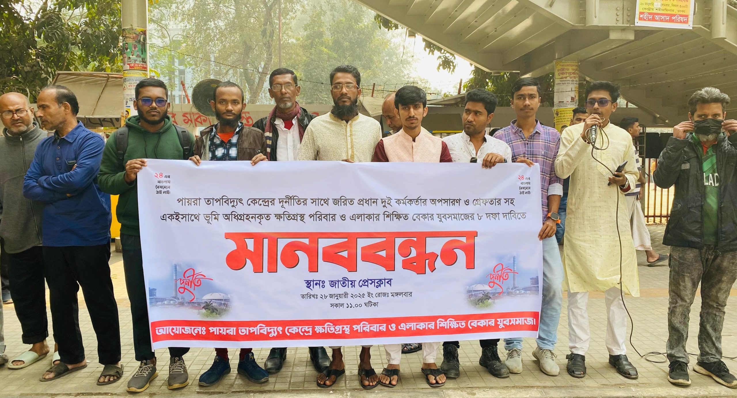 আপন নিউজ অফিসঃ পটুয়াখালীর কলাপাড়ায় পায়রা তাপবিদ্যুৎ কেন্দ্রের দুর্নীতির সঙ্গে জড়িত প্রধান দুই কর্মকর্তার অপসারণ, গ্রেফতার ও একইসঙ্গে ভূমি অধিগ্রহণে ক্ষতিগ্রস্ত পরিবারকে ভুমি অধিগ্রহণের ৩গুন অর্থ প্রদানসহ ও শিক্ষিত যুবকদের আট দফা বাস্তবায়নের লক্ষ্যে জাতীয় প্রেসক্লাবে মানববন্ধন ও সমাবেশ অনুষ্ঠিত হয়েছে।