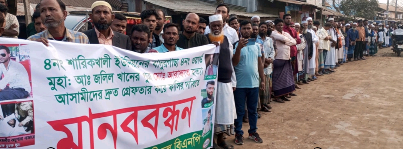 মানববন্ধনে বক্তারা বলেন, প্রকাশ্যে একজন তরতাজা মানুষকে এভাবে কুপিয়ে হত্যা করবে তা মেনে নেয়া যায় না। দ্রæত এ ঘটনার সঙ্গে জড়িত শহীদ সিকদার ও তার দুই ছেলে সোহেল সিকদার, আরাফাত সিকদার ও ভাতিজা বায়েজিদ সিকদারসহ সকলকে গ্রেপ্তারের দাবী জানান তারা। নইলে কঠোর কর্মসুচী দেয়ার ঘোষনা দেন বক্তারা।
