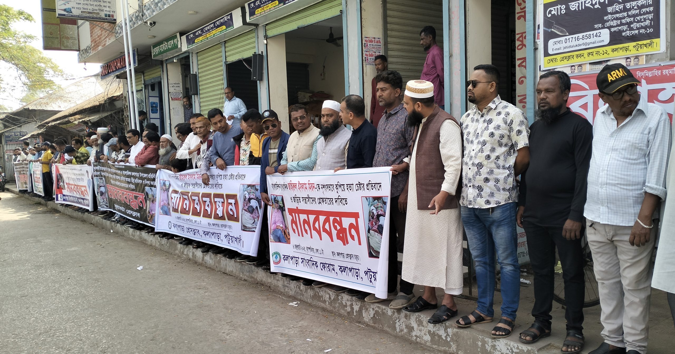 কলাপাড়া প্রেসক্লাবের উদ্যোগে বৃহস্পতিবার দুপুরে এ মানববন্ধন করা হয়। এতে সভাপতিত্ব করেন, কলাপাড়া প্রেসক্লাবের আহ্বায়ক মো হুমায়ুন কবির। বক্তব্য রাখেন কলাপাড়া পৌর বিএনপির সভাপতি গাজী মো ফারুক, সাধারণ সম্পাদক মুসা তাওহীদ নান্নু মুন্সি, মহিপুর থানা বিএনপির সাধারণ সম্পাদক অ্যাডভোকেট শাহজাহান পারভেজ, বিএনপি নেতা জাহাঙ্গীর আলম তালুকদার, উপজেলা যুবদলের আহবায়ক হারুন-অর-রশীদ, কলাপাড়া প্রেসক্লাবের সাবেক সভাপতি মেজবাহউদ্দিন মাননু, সাধারণ সম্পাদক এসএম মোশারফ হোসেন মিন্টু, সাবেক সাধারণ সম্পাদক মহসিন পারভেজ, সাংবাদিক অমল মুখার্জি, জাহিদ রিপন, কুয়াকাটা প্রেসক্লাবের সাধারণ সম্পাদক হোসাইন আমির, কলাপাড়া সাংবাদিক ফোরামের সভাপতি অ্যাডভোকেট জেড এম কাওছার, উপজেলা যুবদলের যুগ্ম আহ্বায়ক সজল বিশ্বাস, পৌর স্বেচ্ছাসেবক দলের আহ্বায়ক রাশেদ মোশাররফ কল্লোল, গণমাধ্যম কর্মী রাসেল মোল্লা, নীল রতন কুন্ডু প্রমুখ।