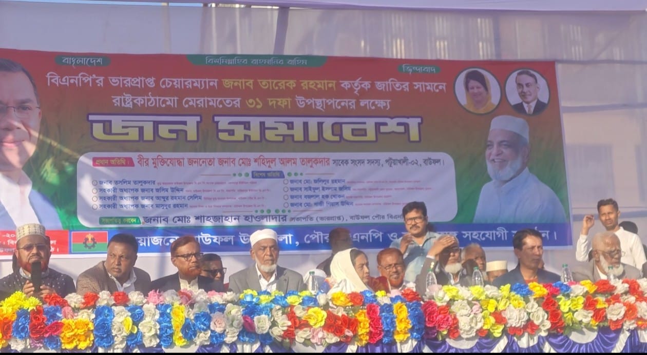 উত্তম কুমার, বাউফলঃ বাউফলে বিএনপি'র ভারপ্রাপ্ত চেয়ারম্যান তারেক রহমান ঘোষিত রাষ্ট্রকাঠামো মেরামতের ৩১ দফা উপস্থাপনের লক্ষ্যে লক্ষ্যে জন সমাবেশ অনুষ্ঠিত হয়েছে। শনিবার (০৮ফেব্রুয়ারি) বিকেলে বাউফল উপজেলা বিএনপির উদ্যোগে পৌর শহরের পাবলিক মাঠে একটি বিশাল জনসমাবেশে অনুষ্ঠিত হয়।