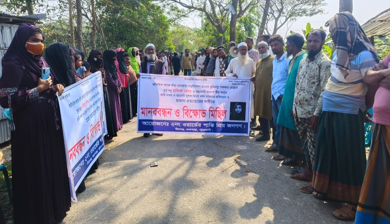 বক্তারা বলেন, নীলগঞ্জের গামইরতলা গ্রামের ভ‚মিদস্যু গফফার মোল্লা, তার পুত্রবধু হাফিজা বেগম ও তাদের সহযোগী জালাল মীর এলাকার নিরীহ মানুষের জমি দখল করে তাদের মিথ্যা মামলা দিয়ে হয়রানি করছে। সবশেষে সবার অজান্তে একটি ধর্ষণ মামলা দিয়ে দুই নং ওয়ার্ড বিএনপির সাংগঠনিক সম্পাদক সোহরাব হোসেন সান্টু, তার ছেলে রাসেল ও ভাগনে রফিকুল ইসলাম, আঃ হক ও রুবেলকে আসামী করে। অথচ এ বিষয়টি এলাকার কেউ জানে না।