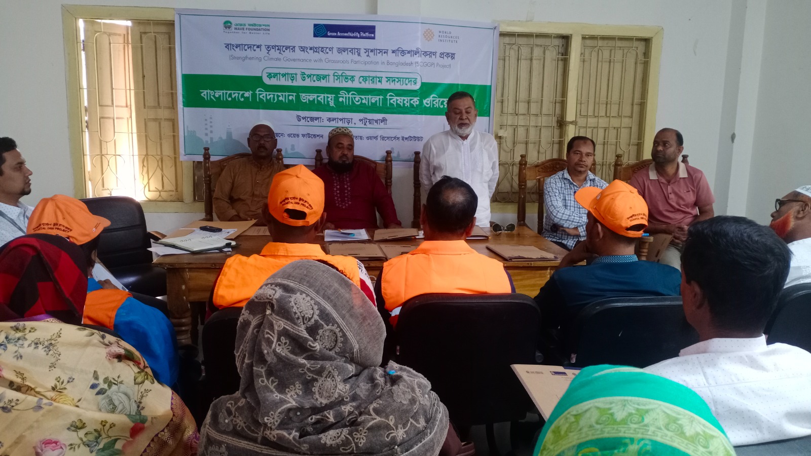 আপন নিউজ অফিসঃ কলাপাড়ায় সিভিক ফোরাম সদস্যদের অংশগ্রহণে বাংলাদেশে বিদ্যমান জলবায়ু নীতিমালা বিষয়ক ওরিয়েন্টেশন সোমবার বেলা ১১ টায় কলাপাড়া অফিসার্স ক্লাবে অনুষ্ঠিত হয়েছে। তৃণমূল জনগোষ্ঠীর অংশগ্রহণের মাধ্যমে জলবায়ু সুশাসন শক্তিশালীকরণ প্রকল্পের উদ্যোগে উন্নয়ন সংস্থা ওয়েভ ফাউন্ডেশন বাস্তবায়নাধীন ওরিয়েন্টেশনে সভাপতিত্ব করেন কলাপাড়া প্রেসক্লাবের আহবায়ক হুমায়ুন কবির।