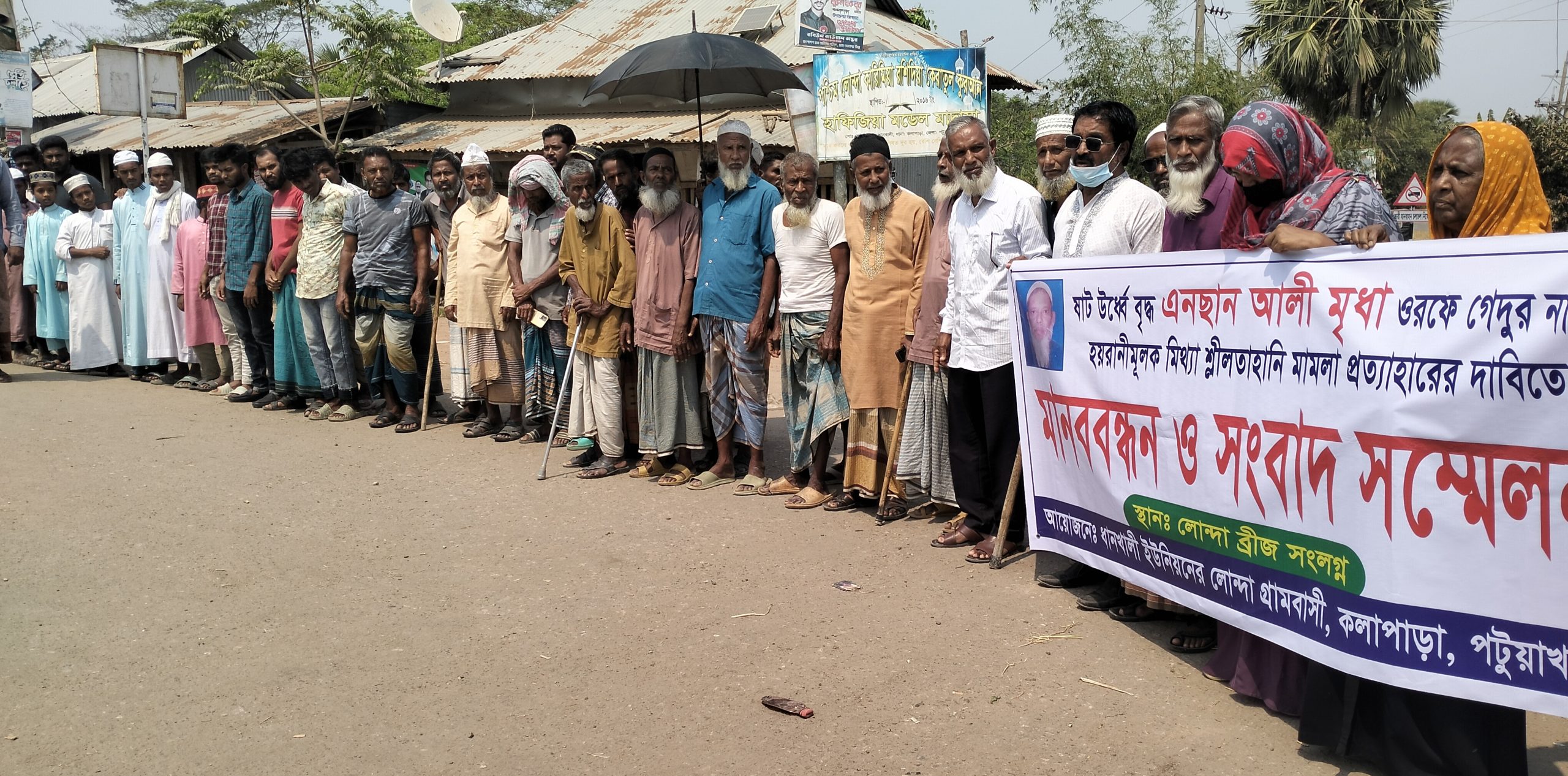 আপন নিউজ অফিসঃ কলাপাড়ায় ১০ বছর বয়সী এক মাদ্রাসা ছাত্রী কে ধর্ষণ চেষ্টার অভিযোগে গ্রেপ্তার বৃদ্ধ এনছান আলী মৃধা ওরফে গেদুর (৬৫) মুক্তির দাবিতে দুই শতাধিক নারী-পুরুষ মানববন্ধন বিক্ষোভ সমাবেশ করেছে। মঙ্গলবার (১১ মার্চ) দুপুরে লোন্দা সড়কে এ কর্মসূচি পালিত হয়। গ্রামের নারী-পুরুষ বৃদ্ধ বয়সী মানুষ এ সমাবেশ মানববন্ধনে অংশ নেন। তারা এ মামলা মিথ্যা হয়রানিমূলক দাবি করে প্রত্যাহারের দাবি জানান।