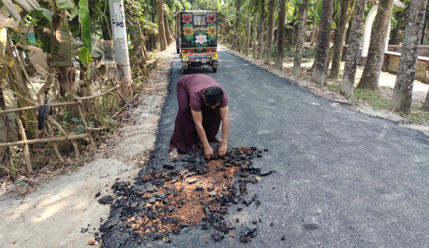 মঙ্গলবার সরেজমিনে গিয়ে দেখাগেছে, তিন কিলোমিটার সড়কের বেশ কয়েকটি স্থানে ঢালাই ওঠে গেছে। স্থানীয়রা বলেন, অটোগাড়ীর চাকায় ঢালাই ওঠে যাচ্ছে। হাত দিয়ে টান দিলেই সড়কের ঢালায় ওঠে যায়। স্থানীয় তিনজন ব্যক্তি সড়কের বিভিন্ন স্থান থেকে হাত দিয়ে টেনে ঢালাই ওঠিয়েছেন। ঢালাই ওঠানোর পরে দেখা যাচ্ছে, ম্যাগাডামের ওপরে কোন বিটুমিন নেই।
