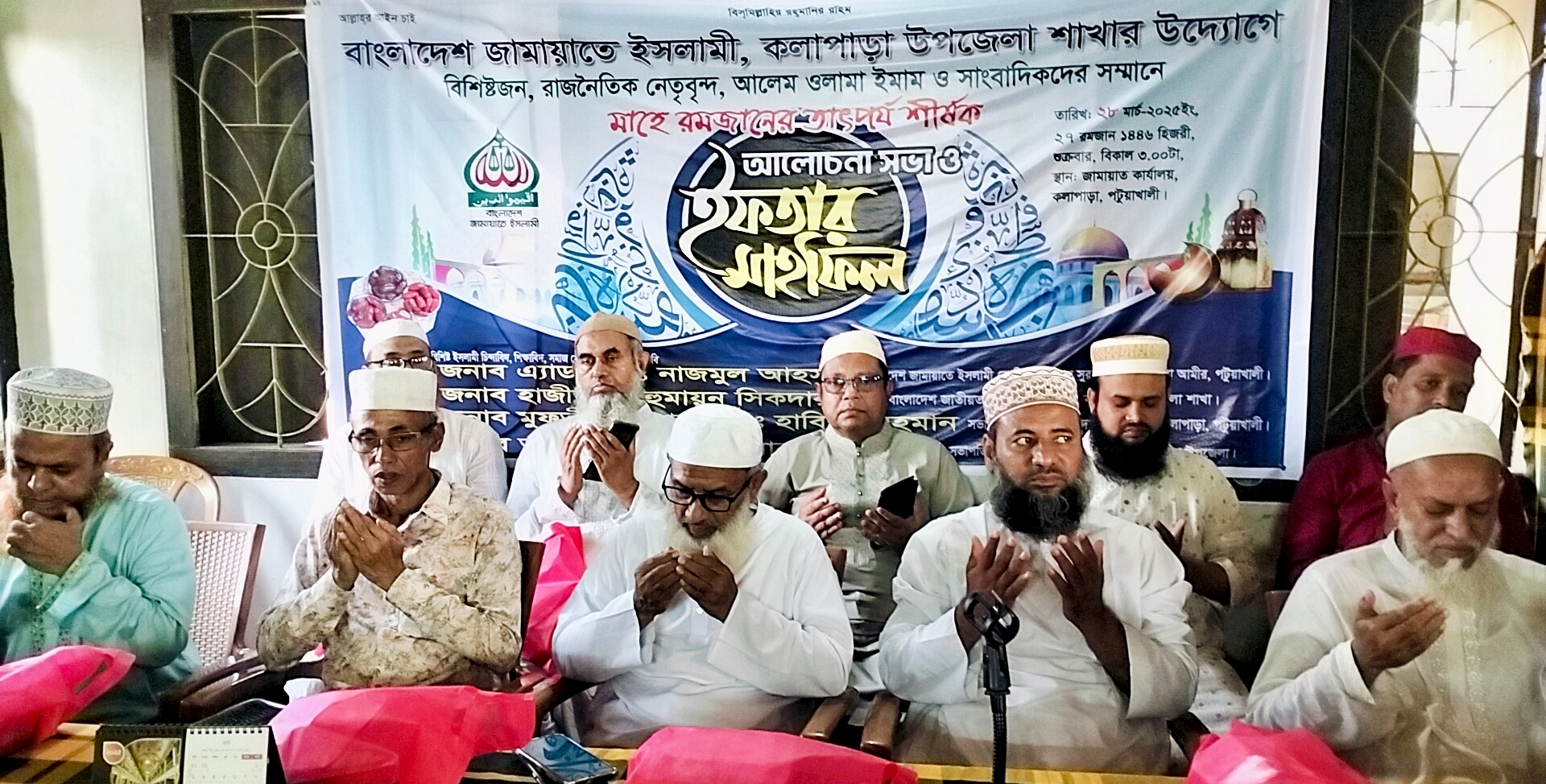 শুক্রবার (২৮ মার্চ) বিকেলে কলাপাড়া উপজেলা জামায়াত কার্যালয়ে এ আলোচনা সভা ও ইফতার মাহফিলের আয়োজন করা হয়। এতে প্রধান অতিথি ছিলেন জেলা জামায়াতের আমীর এ্যাডভোকেট নাজমুল আহসান।
