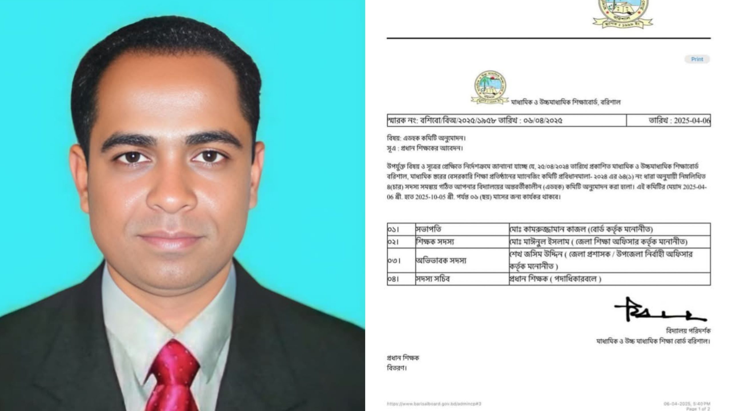 রবিবার (৬ এপ্রিল) মাধ্যমিক ও উচ্চমাধ্যমিক শিক্ষাবোর্ড, বরিশাল এর বোর্ড কর্তৃক মনোনীত হয়। বিদ্যালয়ের পরিচালনা পরিষদের অন্যান্য সদস্য ও সংশ্লিষ্ট কর্তৃপক্ষ তার প্রতি পূর্ণ আস্থা রেখে এ দায়িত্ব অর্পণ করেন।