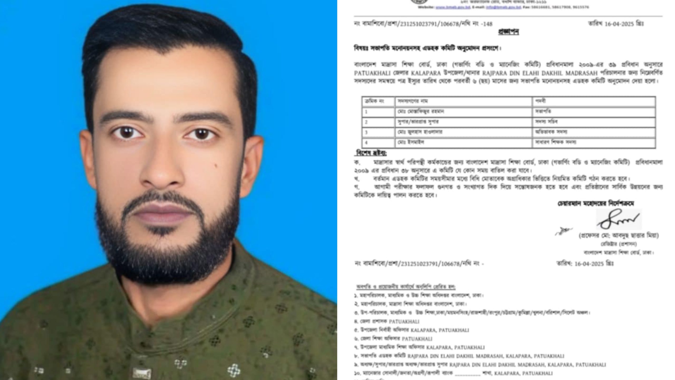 আপন নিউজঃ কলাপাড়া উপজেলার টিয়াখালী ইউনিয়নের রজপাড়া দ্বীন এলাহী দাখিল মাদ্রাসার নতুন এডহক কমিটির সভাপতি হিসেবে মোঃ মোস্তাফিজুর রহমানকে নির্বাচিত করা হয়েছে। বুধবার (১৬ এপ্রিল) বাংলাদেশ মাদ্রাসা শিক্ষা বোর্ড, ঢাকার রেজিস্ট্রার (প্রশাসন) প্রফেসর মো: আবদুছ ছাত্তার মিয়ার স্বাক্ষরিত এক্সপ্রেস বিজ্ঞপ্তির মাধ্যমে এ তথ্য জানানো হয়।