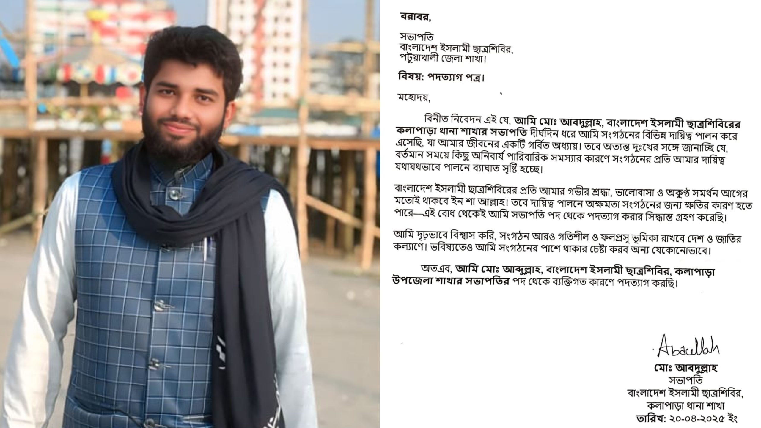আপন নিউজঃ বাংলাদেশ ইসলামী ছাত্রশিবিরের কলাপাড়া থানা শাখার সভাপতি মোঃ আব্দুল্লাহ ব্যক্তিগত কারণে পদত্যাগ করেছেন। সংগঠনের বিভিন্ন দায়িত্ব পালন করে তিনি উল্লেখযোগ্য অবদান রাখলেও সাম্প্রতিক পারিবারিক সমস্যার কারণে সংগঠনের প্রতি দায়িত্ব যথাযথভাবে পালন করতে পারছেন না বলে জানিয়েছেন।