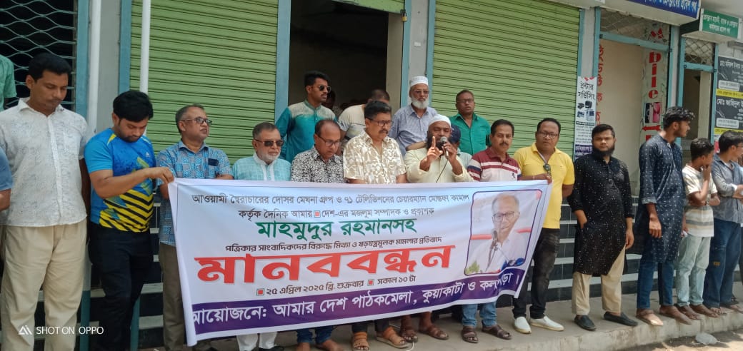 আপন নিউজঃ দেশের পাঠক প্রিয় দৈনিক আমার দেশ পত্রিকার জননন্দিত সম্পাদক মাহামুদুর রহমানের বিরুদ্ধে দায়ের করা ষড়যন্ত্র মূলক মিথ্যা মামলার প্রত্যাহার, দোষীদের শাস্তি নিশ্চিত করনের দাবীতে মানববন্ধন অনুষ্ঠিত হয়েছে। শুক্রবার বেলা সাড়ে এগারটায় কলাপাড়া প্রেসক্লাবের সামনে এ কর্মসূচি অনুষ্ঠিত হয়েছে।