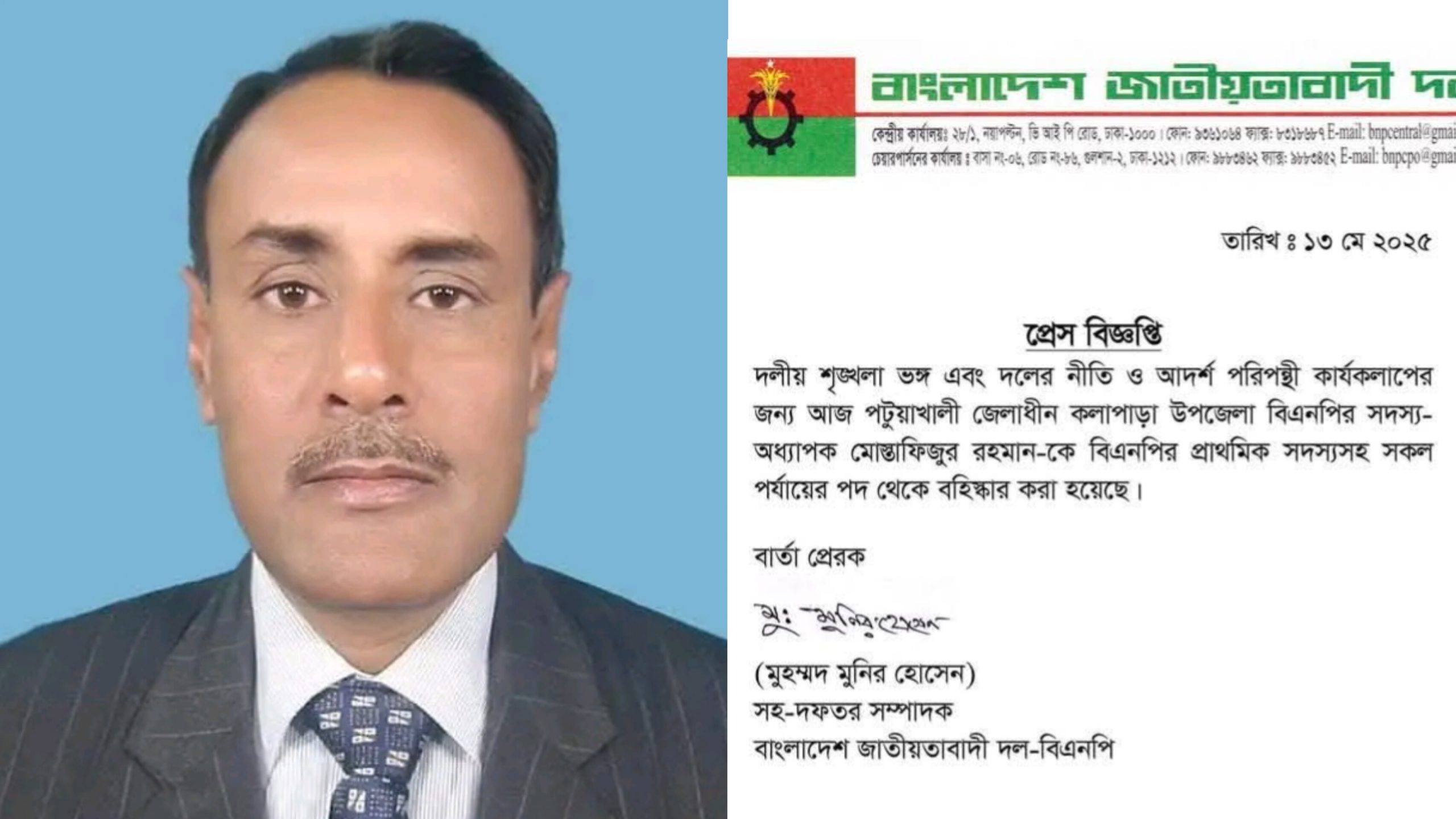 আপন নিউজঃ দলীয় শৃঙ্খলা ভঙ্গ এবং দলের নীতি ও আদর্শ পরিপন্থী কর্মকাণ্ডে জড়িত থাকার অভিযোগে কলাপাড়া উপজেলার বিএনপির সদস্য অধ্যাপক মোস্তাফিজুর রহমানকে দল থেকে বহিষ্কার করেছে বাংলাদেশ জাতীয়তাবাদী দল-বিএনপি।
