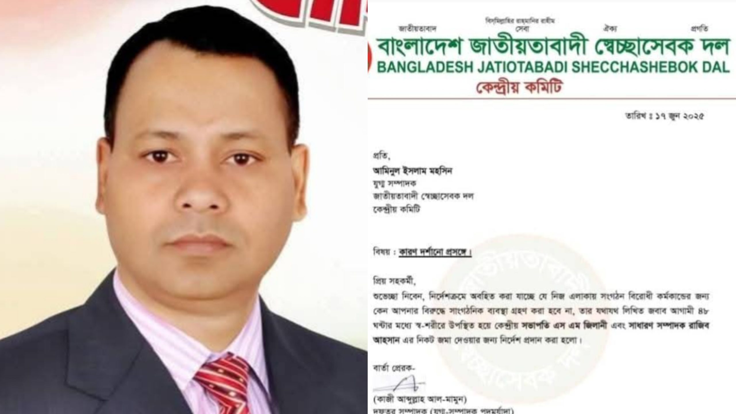 নোটিশে বলা হয়, নির্দেশক্রমে অবহিত করা যাচ্ছে যে নিজ এলাকায় সংগঠন বিরোধী কর্মকান্ডের জন্যেকেন আপনার বিরুদ্ধে সাংগঠনিক ব্যবস্থা নেয়া হবে না, তার যথাযথ লিখিত জবাব আগামী ৪৮ ঘন্টার মধ্যে স্বশরীরে উপস্থিত হয়ে কেন্দ্রীয় সভাপতি এসএম জিলানী সাধারন সম্পাদক রাজিব আহসান এর নিকট জমা দেয়ার নির্দেশ প্রদান করা হয়েছে।