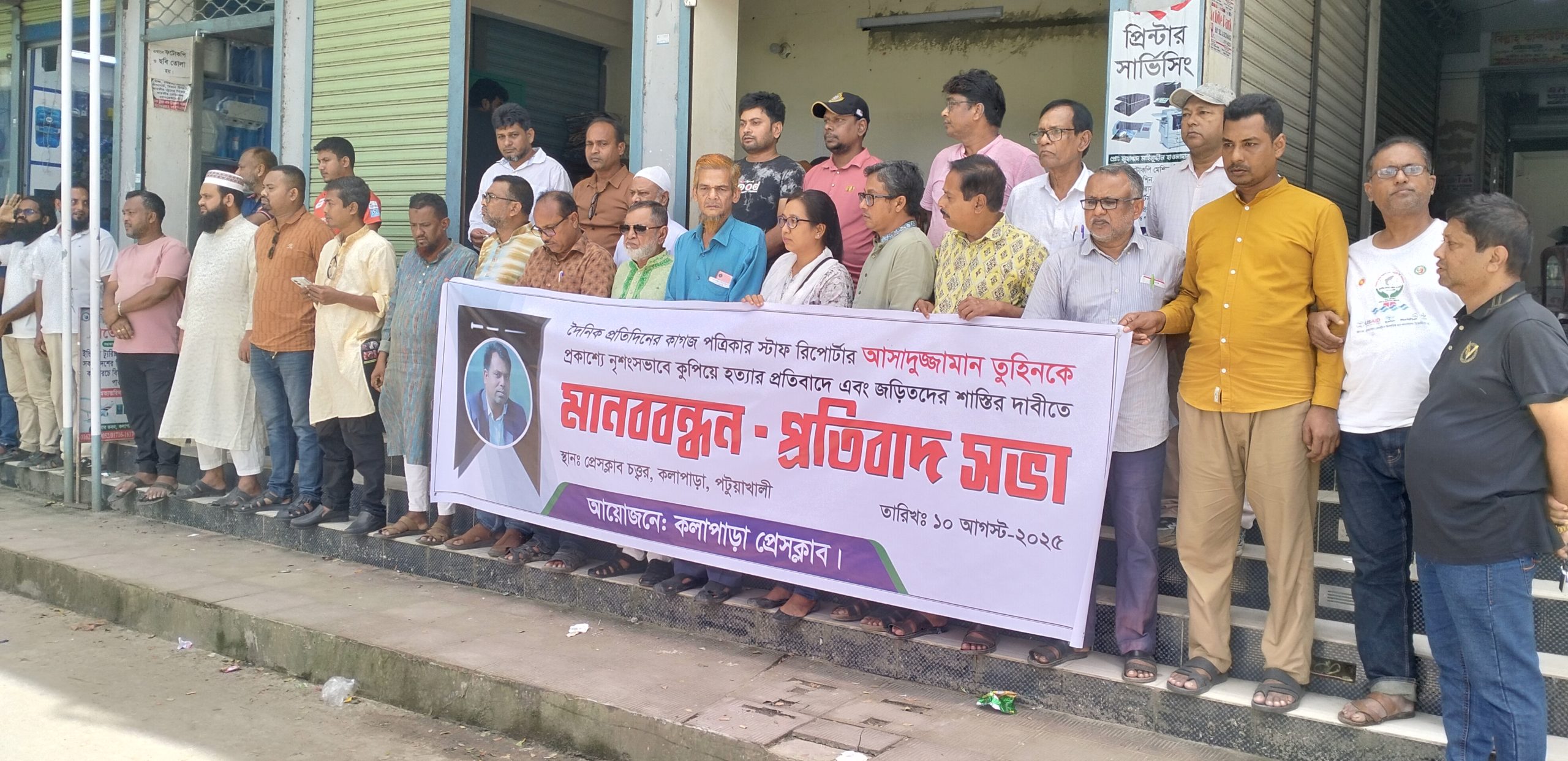 আপন নিউজ ডেস্কঃ দৈনিক প্রতিদিনের কাগজ পত্রিকার স্টাফ রিপোর্টার আসাদুজ্জামান তুহিনকে প্রকাশ্যে নৃশংসভাবে কুপিয়ে হত্যার প্রতিবাদে এবং জড়িতদের দ্রুত গ্রেপ্তার ও দৃষ্টান্তমূলক শাস্তির দাবিতে কলাপাড়ায় মানববন্ধন ও প্রতিবাদ সভা অনুষ্ঠিত হয়েছে।