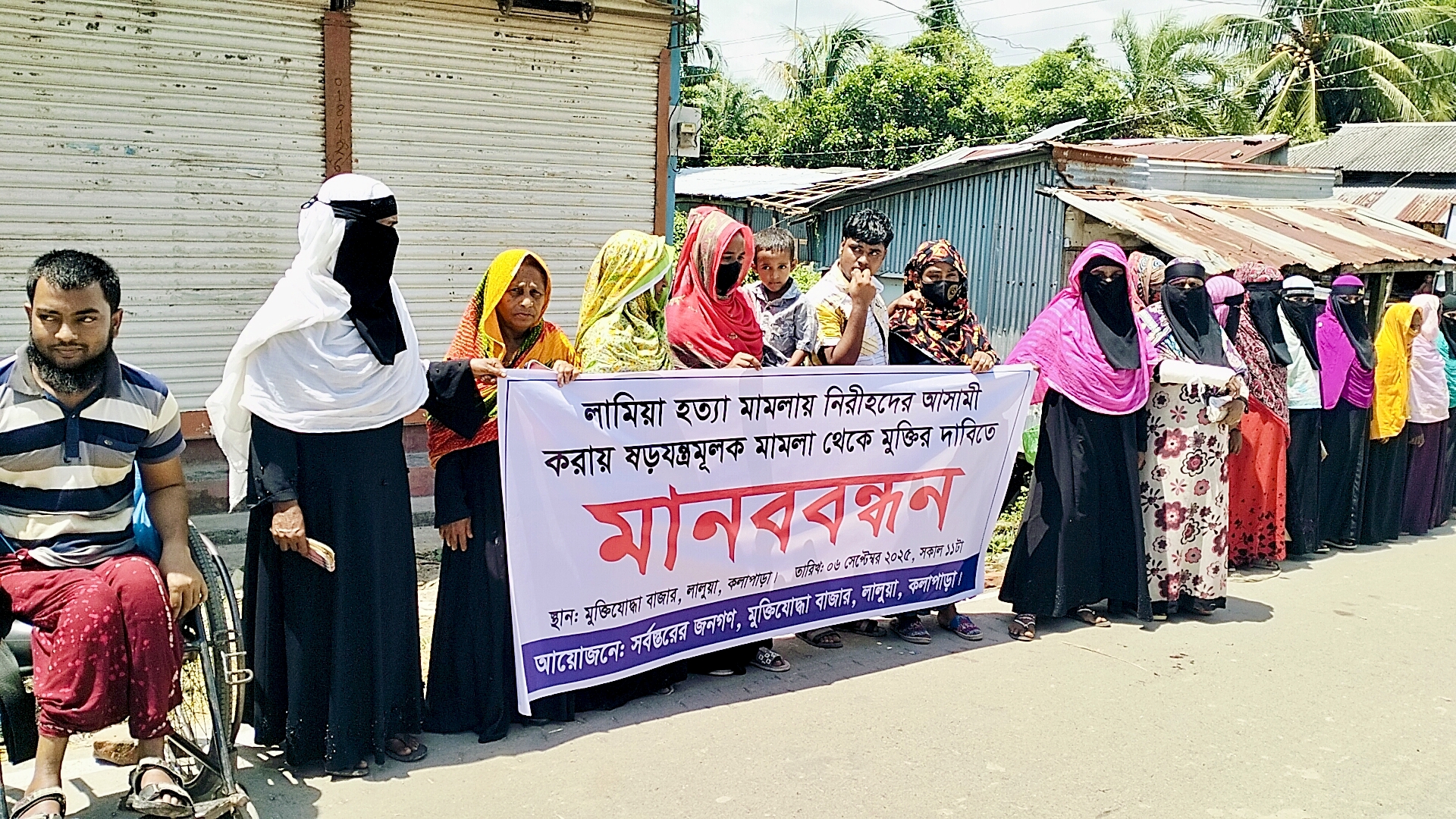 আপন নিউজ ডেস্কঃ কলাপাড়ায় লামিয়া হত্যার ঘটনায় নিরীহ গ্রামবাসীদের নামে মিথ্যা মামলা প্রত্যাহার ও প্রকৃত অপরাধীদের চিহ্নিত এবং তাদের গ্রেফতারের দাবিতে বিক্ষোভ মিছিল ও মানববন্ধন করেছে শতশত গ্রামবাসী।