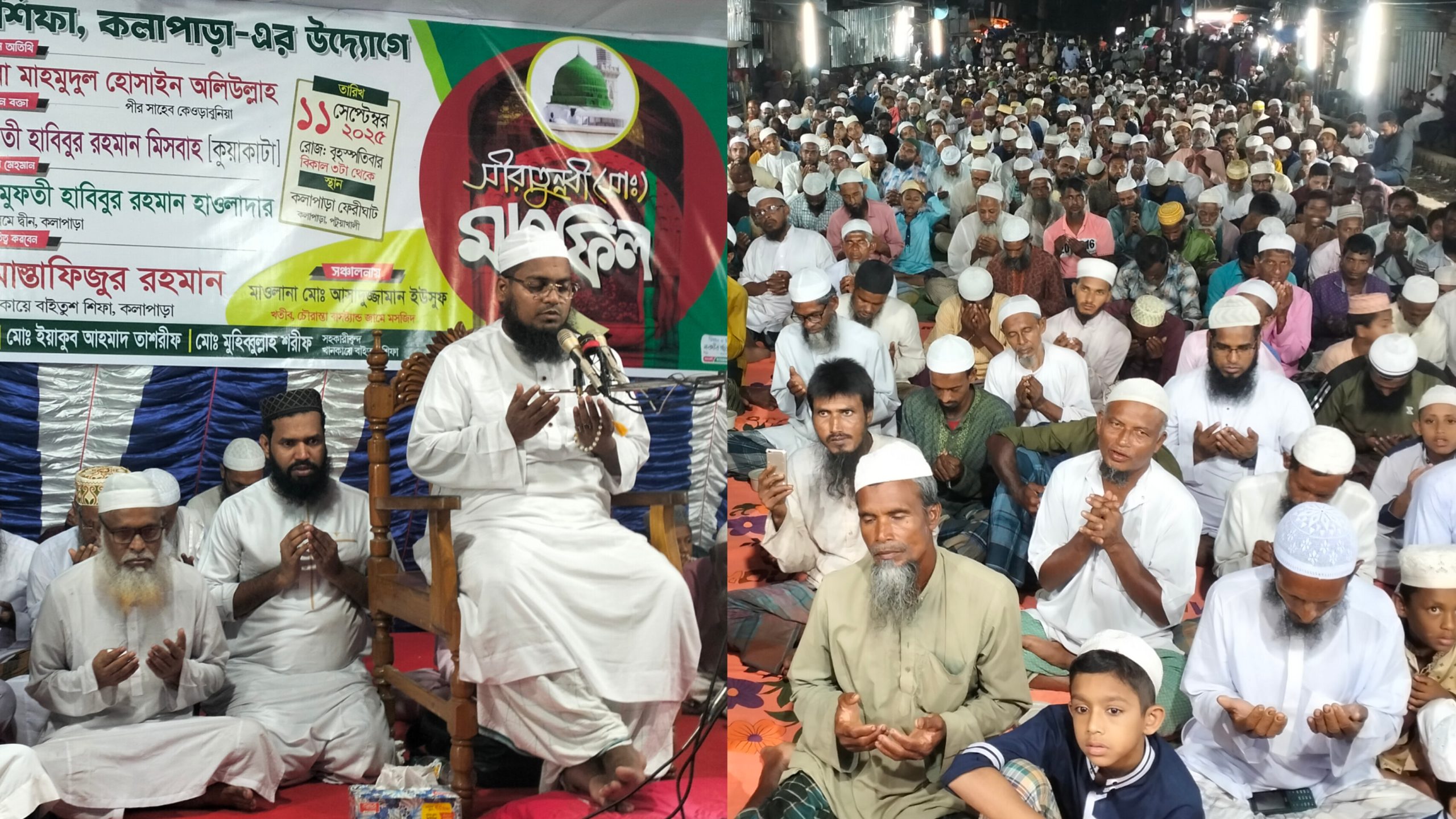 খানকায়ে বাইতুশ শিফা, কলাপাড়া-এর প্রতিষ্ঠাতা পরিচালক মাওলানা মোস্তাফিজুর রহমানের সভাপতিত্বে মাহফিল পরিচালিত হয়। এ সময় তিনি বলেন, “সীরাতুন্নবী (সাঃ)-এর আলোকে আমাদের জীবন গড়ে তুলতে হবে। সমাজ থেকে অন্যায়, অবিচার ও অশান্তি দূর করে মানবকল্যাণে কাজ করাই হবে আমাদের মূল লক্ষ্য। এই ধরনের মাহফিল আমাদের ঈমানকে দৃঢ় করতে সহায়তা করে।” পরে দেশ ও জাতির কল্যাণ কামনায় বিশেষ দোয়া মোনাজাত করা হয়। সঞ্চালনা করেন নাচনাপাড়া চৌরাস্তা বাসস্ট্যান্ড জামে মসজিদের খতীব মাওলানা আসাদুজ্জামান ইউসুফ।