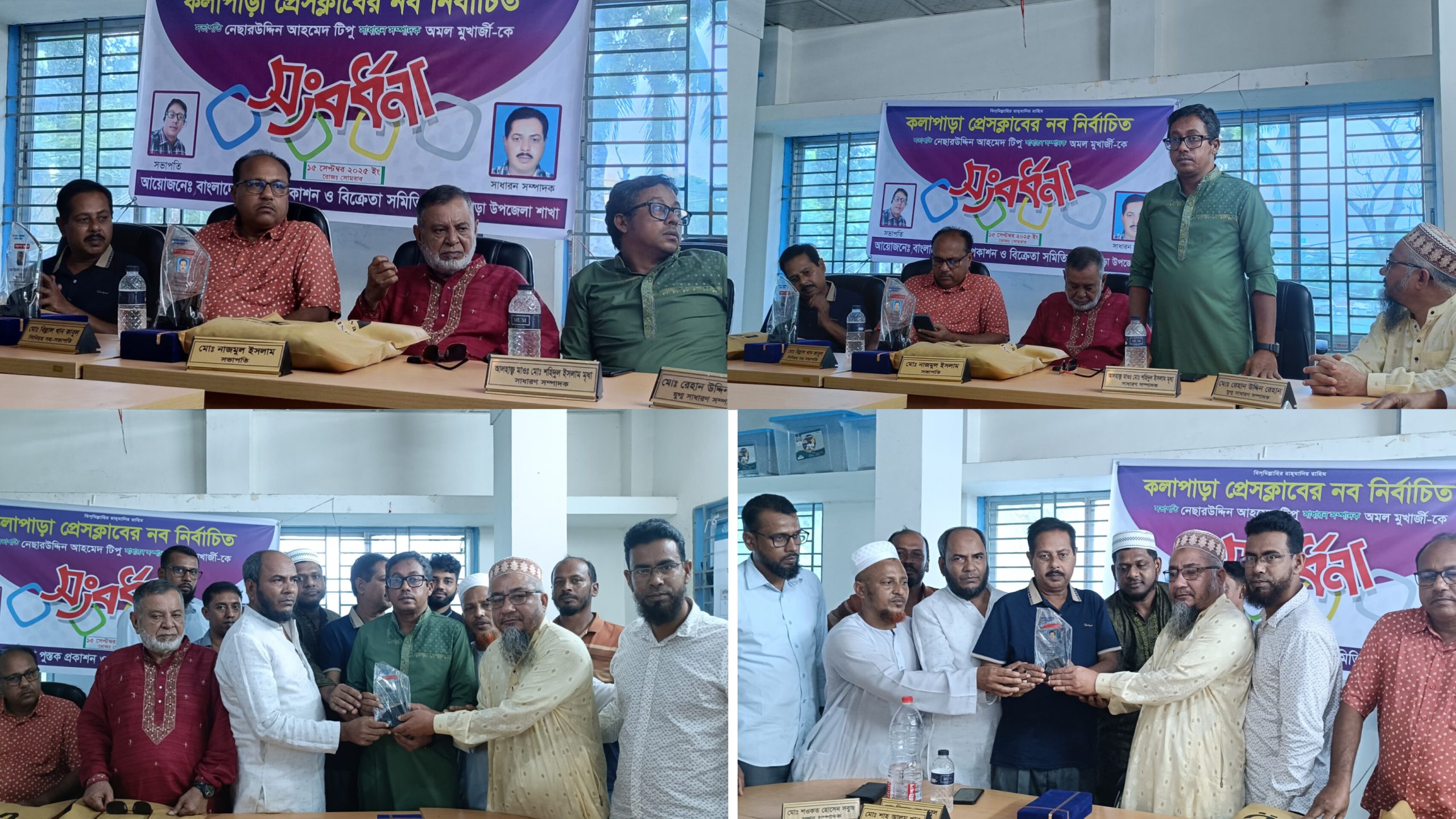 আপন নিউজ ডেস্কঃ কলাপাড়া প্রেসক্লাবের নবনির্বাচিত সভাপতি নেছারউদ্দিন আহমেদ টিপু ও সাধারণ সম্পাদক অমল মুখার্জি'কে সংবর্ধনা জানিয়েছে বাংলাদেশ পুস্তক প্রকাশক ও বিক্রেতা সমিতি কলাপাড়া উপজেলা শাখা। সোমবার (১৫ সেপ্টেম্বর) বেলা ১২টায় কলাপাড়া ব্যবসায়ী সমিতির কার্যালয়ে এ সংবর্ধনা অনুষ্ঠান অনুষ্ঠিত হয়।