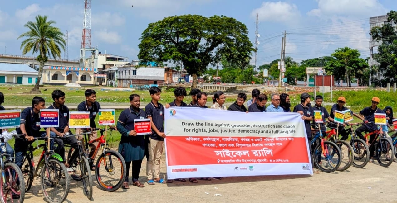 আপন নিউজ ডেস্কঃ অধিকার, কর্মসংস্থান, ন্যায়বিচার, গণতন্ত্র এবং পরিবেশবান্ধব বাস উপযোগী পরিপূর্ণ জীবনের জন্য কলাপাড়ায় সাইকেল র্যালী ও মানববন্ধন অনুষ্ঠিত হয়েছে। মানববন্ধন ও র্যালীতে শিক্ষার্থী, পরিবেশ কর্মী, গণমাধ্যম কর্মীসহ বিভিন্ন সামাজিক-সাংস্কৃতিক সংগঠনের প্রতিনিধিরা অংশগ্রহণ করেন। শুক্রবার সকাল ১০টায় কলাপাড়া পৌরশহরের আন্ধারমানিক নদী তীরের হেলিপ্যাড মাঠে মানববন্ধন শেষে সাইকেল র্যালী শহর প্রদক্ষিণ শেষে প্রেসক্লাব চত্বরে শেষ হয়।