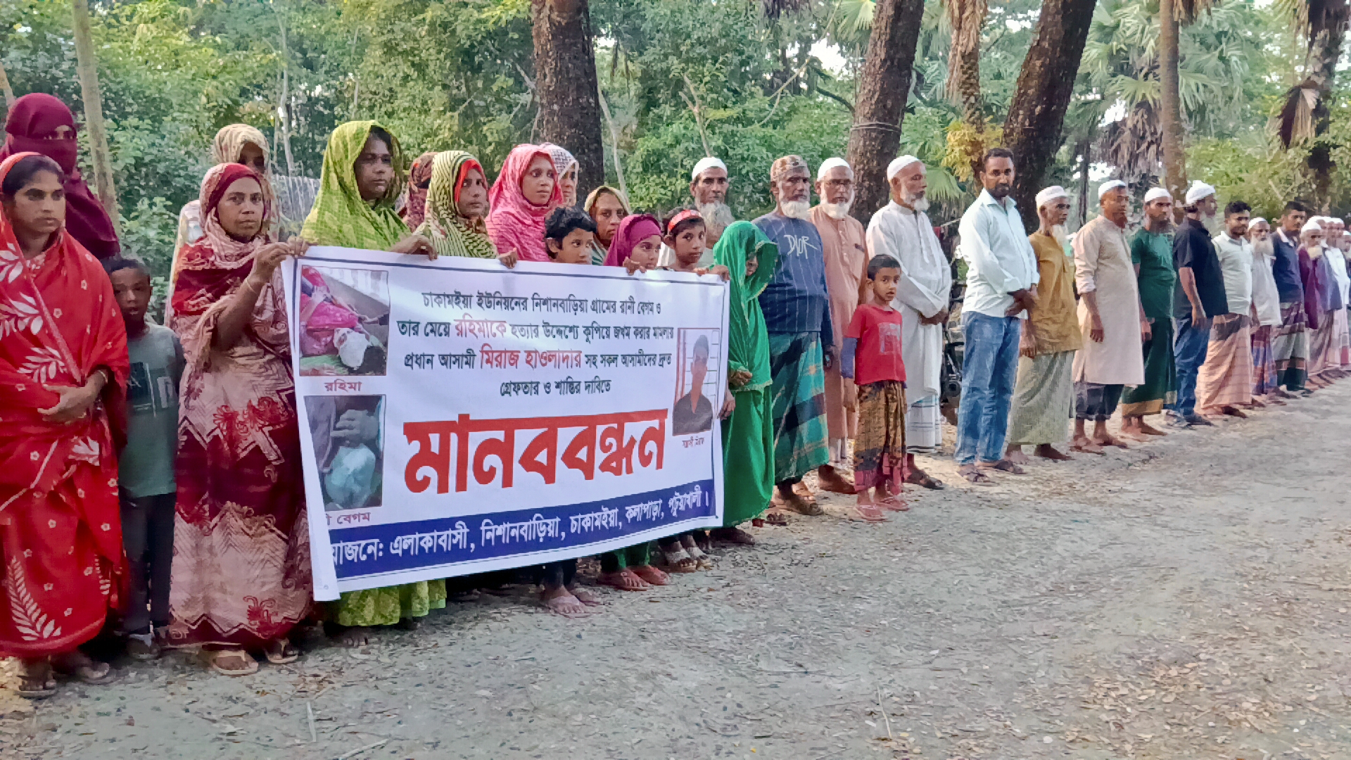 সোমবার (২০ অক্টোবর) বিকালে উপজেলার চাকামইয়া ইউনিয়নের পশ্চিম নিশানবাড়িয়া গ্রামে এলাকাবাসীর উদ্যোগে এ মানববন্ধন অনুষ্ঠিত হয়।