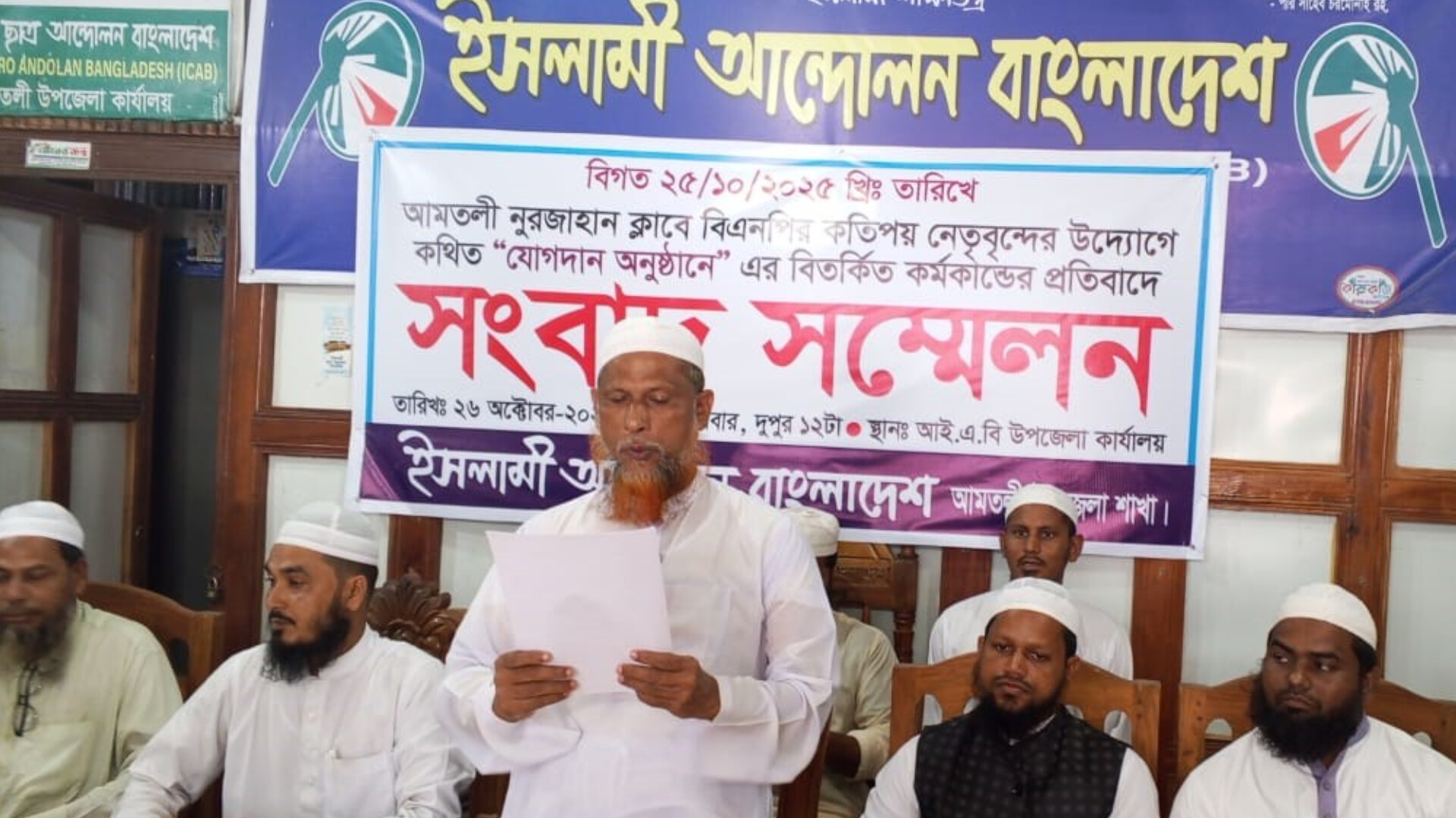 জানাগেছে, শনিবার রাতে ইসলামী আন্দোলন বাংলাদেশ আমতলী সদর ইউনিয়নের ৮ নং ওয়ার্ড শাখার বহিস্কৃত সভাপতি মোঃ নাশির উদ্দিন হাওলাদারের নেতৃত্বে তিন শতাধিক নেতাকর্মী বিএনপি দলীয় কার্যালয়ে বরগুনা জেলা বিএনপির আহবায়ক নজরুল ইসলাম মোল্লা ও আমতলী উপজেলা বিএনপির সাবেক সভাপতি মোঃ জালাল উদ্দিন ফকিরের হাত ফুলের তোড়া দিয়ে বিএনপিতে যোগদান করেন। এ নিয়ে ইসলামী আন্দোলন নেতাকর্মীদের মধ্যে ক্ষোভের সৃষ্টি হয়। ওই যোগদান অনুষ্ঠানে উল্লেখ করা হয় ইসলামী আন্দোলন বাংলাদেশ আমতলী সদর ইউনিয়নের নেতাকর্মীরা দল ছেড়ে বিএনপিতে যোগদান করেছেন। এ ঘটনাকে কেন্দ্র করে রবিবার দুপুরে ইসলামী আন্দোলন বাংলাদেশ আমতলী উপজেলা শাখার সভাপতি মাওলানা ওমর ফারুক জিহাদী দলের পক্ষ থেকে সংবাদ সম্মেলনে অভিযোগ করেছেন নাশির উদ্দিন হাওলাদার দলীয় শৃঙ্খলা ভঙ্গের দায়ে গত ৫ অক্টোবর তাকে দলের সদস্যসহ সকল পথ থেকে অব্যহতি দেয়া হয়েছে। তিনি দলীয় পদ গোপন রেখে সাধারণ মানুষকে পাঁচকল্লি টুপি পড়িয়ে ইসলামী আন্দোলন বাংলাদেশ দলের নেতাকর্মী সাজিয়ে বিএনপিতে যোগদান করিয়েছেন। সংবাদ সম্মেলনে আরো অভিযোগ করা হয় ওই যোগদান অনুষ্ঠানে কেউ ইসলামী আন্দোলন বাংলাদেশ দলের নেতাকর্মী ছিল না, এমনকি চরমোনাই মতাদর্শী কোন লোকজনও ছিল না। ইসলামী আন্দোলন বাংলাদেশ দলের ভাবমুর্তি ক্ষুন্ন করতেই নাশির উদ্দিন হাওলাদার এমন কাজ করেছেন। তার এমন কাজের তীব্র নিন্দা জানান তিনি। সংবাদ সম্মেলনে আরো উপস্থিত ছিলেন ইসলামী আন্দোলন বাংলাদেশ আমতলী উপজেলা শাখার সাধারণ সম্পাদক গাজী মোঃ বায়েজিদ, সাংগঠনিক সম্পাদক হাফেজ মাওলানা ইউসুফ মাতুব্বর, আলহাজ্ব মৌলভী মোঃ শাহ আলম, যুব আন্দোলন আমতলী উপজেলা শাখার সভাপতি হাফেজ মাওলানা খালেক সাইফুল্লাহ, সাধারণ সম্পাদক হাফেজ মোঃ ইশা শাহিদী, শ্রমিক আন্দোলন সাধারণ সম্পাদক মাওলানা মীর মোঃ সোলাইমান, ছাত্র আন্দোলন উপজেলা শাখার সভাপতি জাহিদুল ইসলাম ও সাধারণ সম্পাদক হাফেজ আবু রায়হান প্রমুখ।