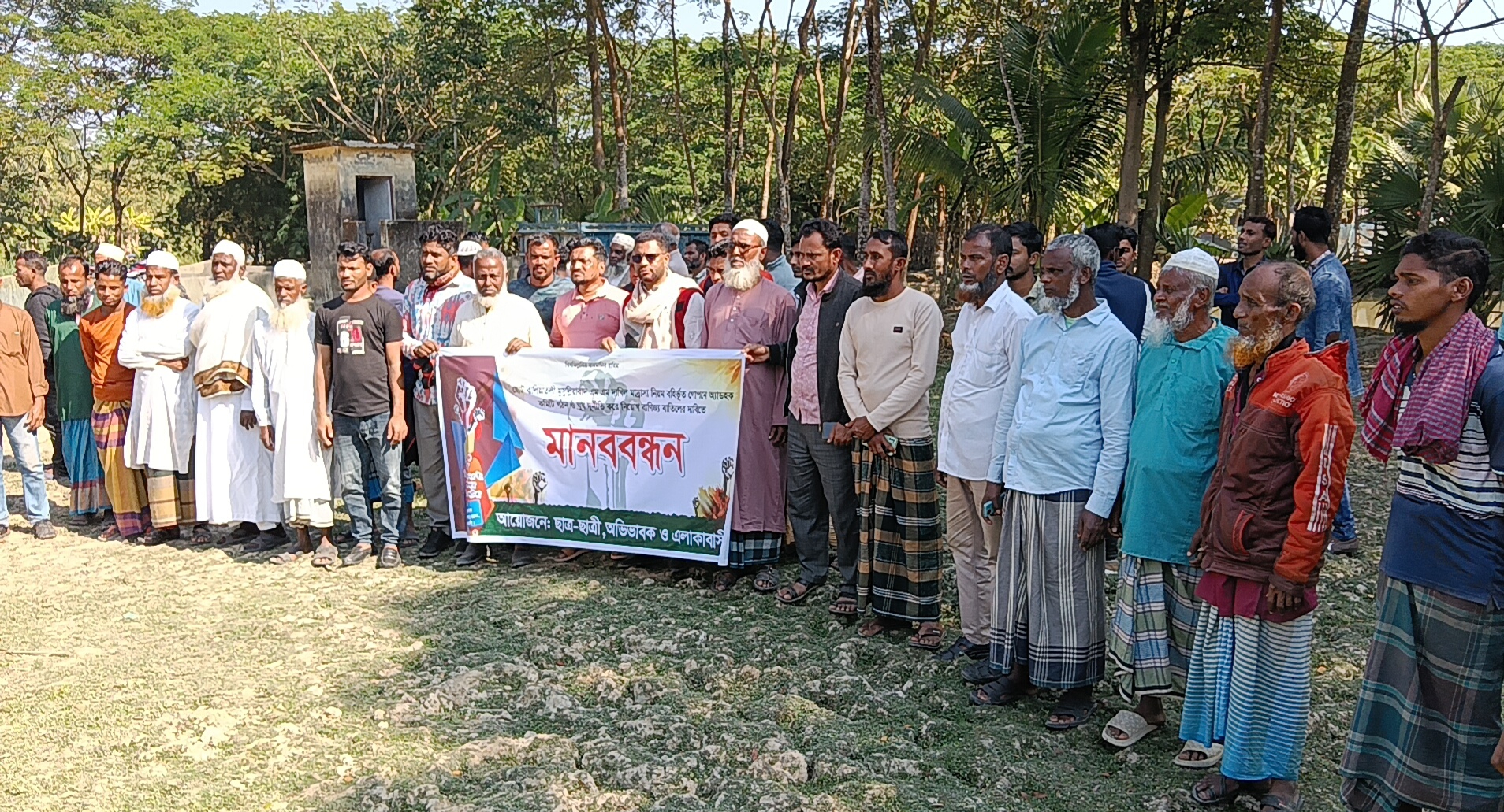 বৃহস্পতিবার (১৮ ডিসেম্বর) বেলা ১১টায় ওই মাদ্রাসা প্রাঙ্গনে এ মানববন্ধন অনুষ্ঠিত হয়। এতে বক্তব্য রাখেন ইউপি সদস্য ইউসুফ আলম, অভিভাবক ইব্রাহিম তালুকদার, আবদুল আজিজ খান ও আঃ ছালাম সিকদার। মানববন্ধনে এলাকার শত শত মানুষ অংশগ্রহণ করেন।