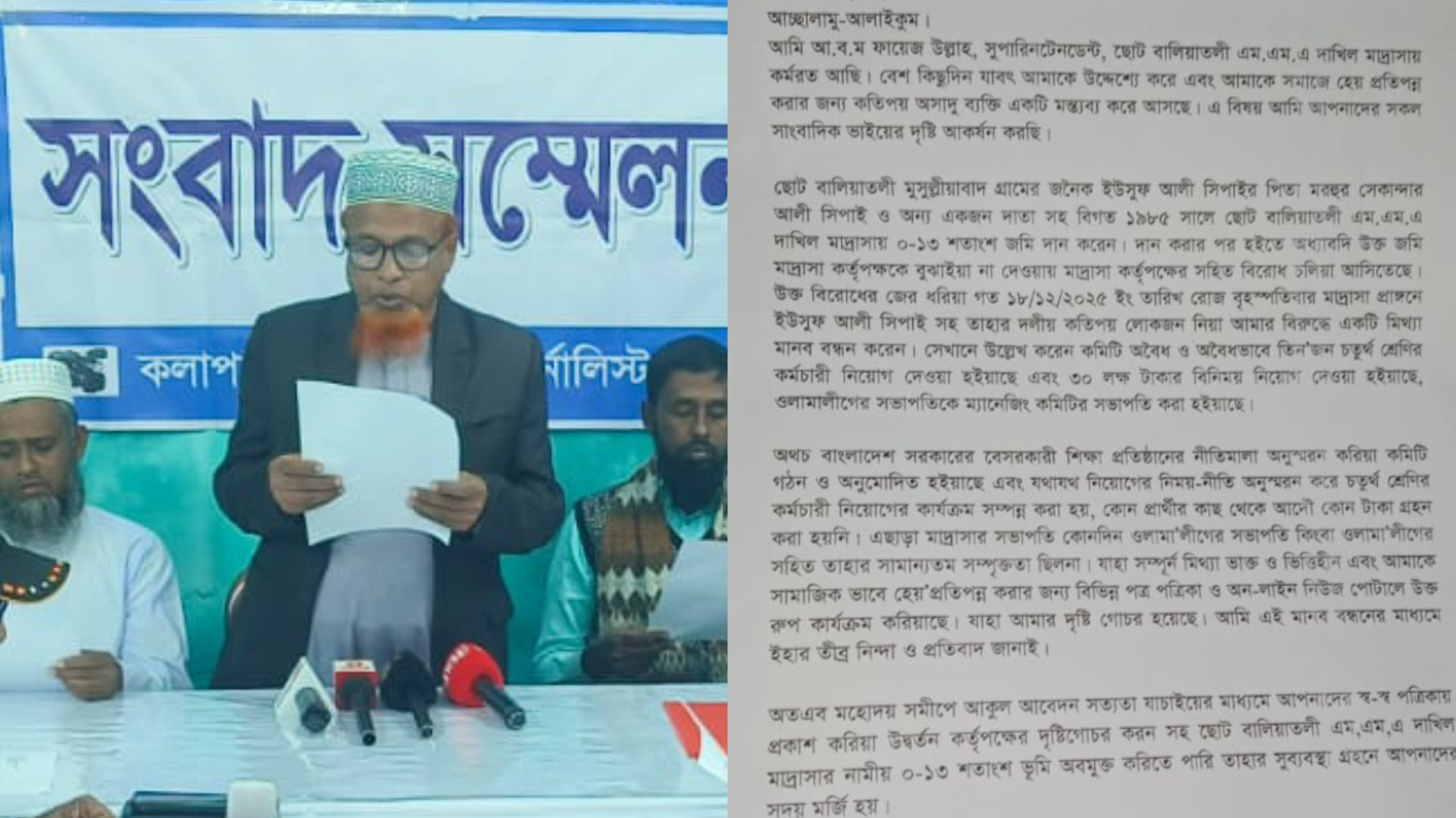 শুক্রবার সকাল সাড়ে দশটায় কলাপাড়া টেলিভিশন জার্নালিস্ট ফোরামে এ সংবাদ সম্মেলন করেন। এসময় উপস্থিত ছিলেন ১০ শতাংশ জমিদাতা মেছের আলী খানের ছেলে আবদুল জব্বার খান, ৮ শতাংশ জমিদাতা আবদুর রহমান খানের ছেলে, শাহিন খান ওই মাদ্রাসার সহকারী মৌলভী রউফুল ইসলাম, সহকারী শিক্ষক আতিকুর রহমান, মনিরুল ইসলাম, নজরুল ইসলাম ও হাবিবুর রহমান।