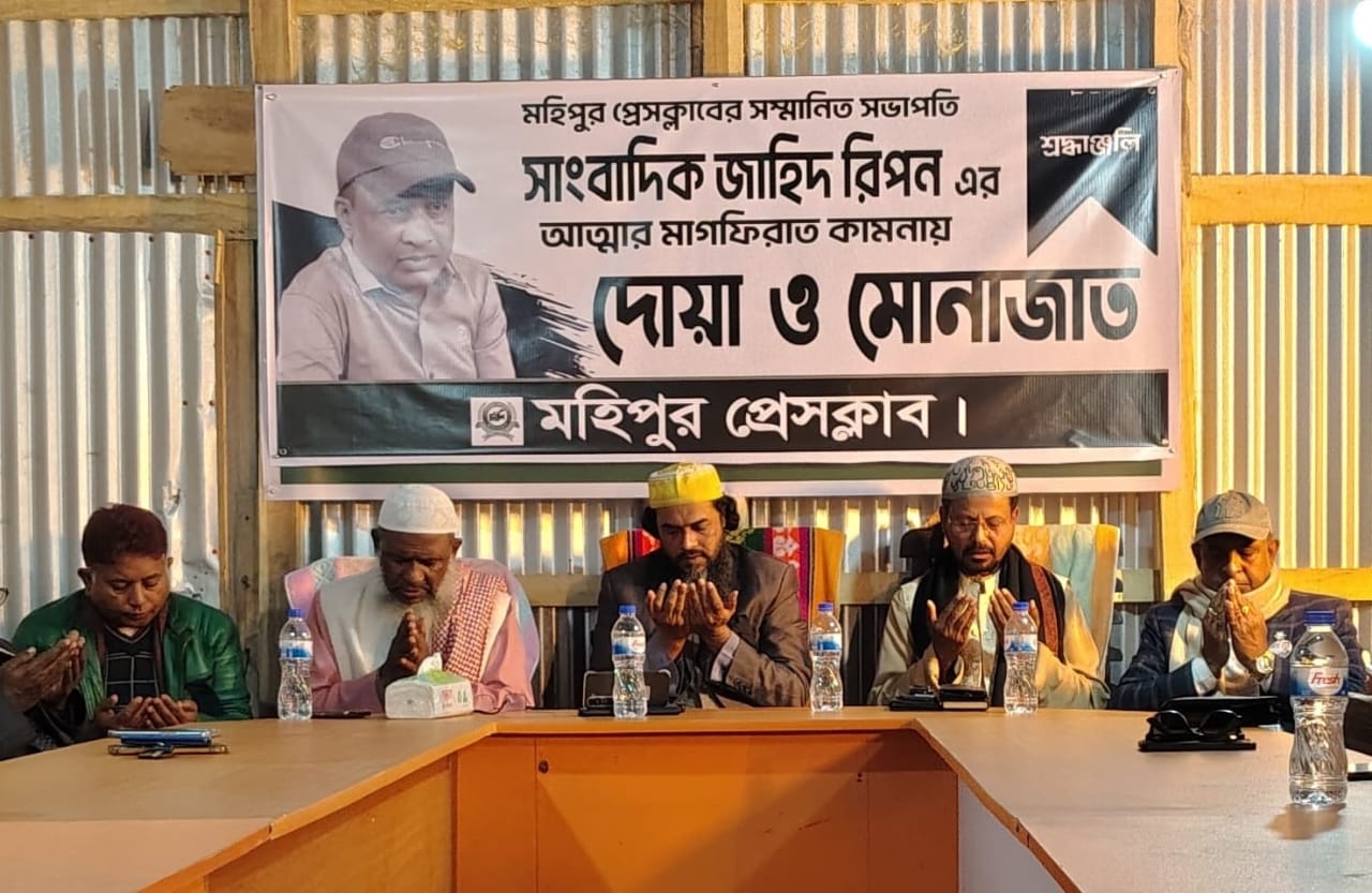 মোঃ মাহতাব হাওলাদার, মহিপুরঃ মহিপুর প্রেসক্লাবের সভাপতি সাংবাদিক জাহিদ রিপনের রুহের মাগফিরাত কামনায় দোয়া ও মোনাজাত অনুষ্ঠিত হয়েছে। শনিবার (১০ জানুয়ারি) বিকাল ৪টায় মহিপুর প্রেসক্লাবের হলরুমে এ দোয়া মাহফিলের আয়োজন করা হয়।