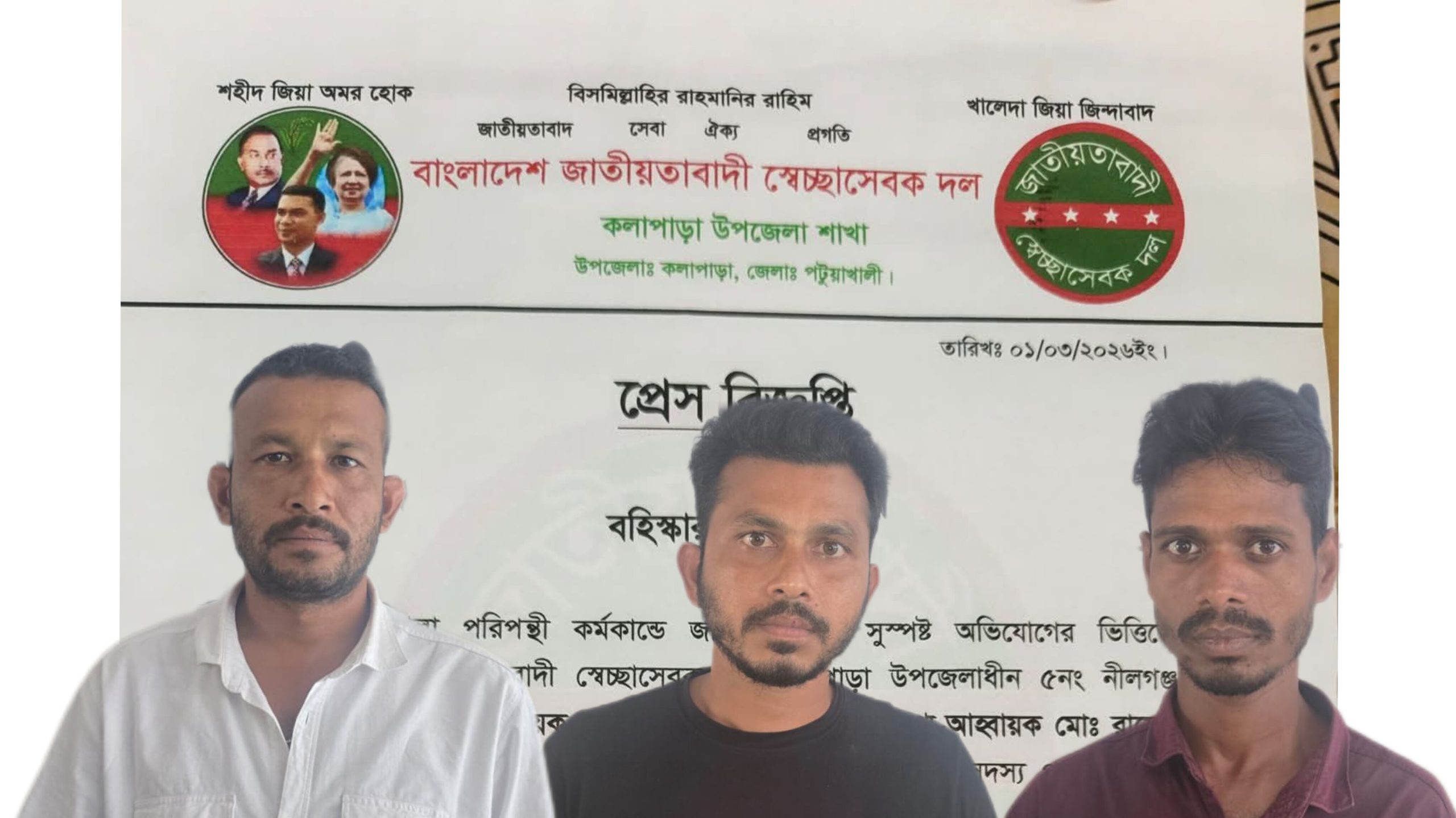 বহিষ্কৃতরা হলেন-নীলগঞ্জ ইউনিয়ন শাখার আহ্বায়ক মোঃ সোহানুর রহমান সুমন, যুগ্ম-আহ্বায়ক মোঃ রাসেল হাওলাদার এবং সদস্য মোঃ সজিব ফকির। তাদের দলের প্রাথমিক সদস্যপদসহ সকল পর্যায়ের পদ থেকে অব্যাহতি দেওয়া হয়েছে।