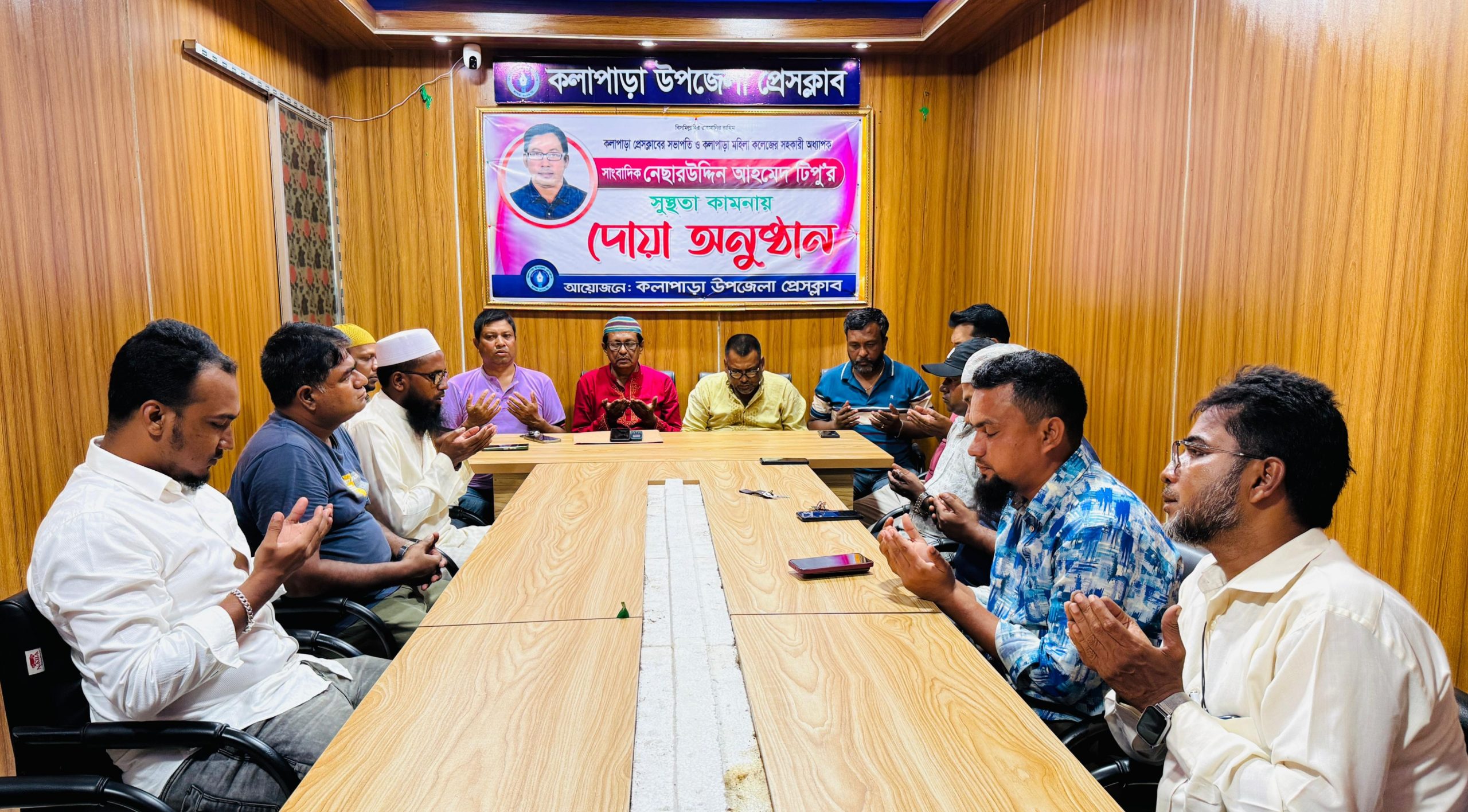 কলাপাড়া প্রতিনিধিঃ কলাপাড়া প্রেসক্লাবের সভাপতি ও কলাপাড়া মহিলা ডিগ্রি কলেজের সহকারী অধ্যাপক নেছারউদ্দীন আহমেদ টিপু'র সুস্থতা কামনায় দোয়া মিলাদ অনুষ্ঠিত হয়েছে। কলাপাড়া উপজেলা প্রেসক্লাবের আয়োজনে মঙ্গলবার (১৪ এপ্রিল) সন্ধ্যা ৭ টায় ক্লাব'র হল রুমে এ দোয়া মিলাদ অনুষ্ঠিত হয়। দোয়া মিলাদে উপজেলা প্রেসক্লাব'র সভাপতি মো. কবির তালুকদার, সাধারণ সম্পাদক এসকে রঞ্জন, সহ-সভাপতি নাহিদুল হক, যুগ্ম সাধারণ সম্পাদক রাসেল মোল্লা, অর্থ সম্পাদক মো. ওমর ফারুক, প্রচার সম্পাদক নয়নাভিরাম গাইন নয়ন, দপ্তর সম্পাদক সিয়াম আবদুল্লা, কার্যকরী পরিষদের সদস্য মো.আরিফ সিকদার, মো.তাজুল ইসলাম আজাদ, সদস্য সগির হোসেন, সদস্য এস এম আলমগীর হোসেন ও সিমন প্রমুখ। উপস্থিত সকলে মহান আল্লাহর দরবারে ফরিয়াদ জানিয়েছে যাতে নেছার উদ্দীন আহমেদ টিপু অতি দ্রুত সুস্থ হয়ে সকলের মাঝে ফিরে আসে এমন প্রত্যাশা সকলের।