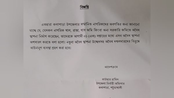 আপন নিউজ ডেস্কঃ কলাপাড়া উপজেলার খাল, রাস্তা, খাস জমি ও অন্যান্য সরকারি জমিতে গড়ে ওঠা সকল অবৈধ স্থাপনা অপসারণে কঠোর নির্দেশনা দিয়েছে উপজেলা প্রশাসন। অবৈধ দখলদারদের আগামী এক সপ্তাহের মধ্যে আরও পড়ুন