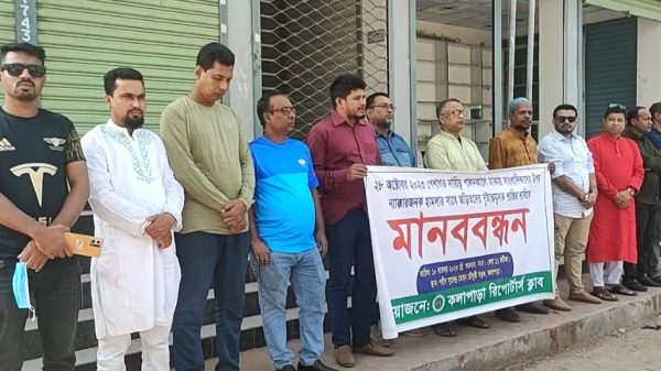 আপন নিউজ অফিসঃ পেশাগত দায়ীত্ব পালন কালে ঢাকায় ২৮ অক্টোবর সাংবাদিকদের উপর ন্যাক্কারজনক হামলার প্রতিবাদে ও অপরাধীদের দৃষ্টান্তমূলক শাস্তির দাবিতে কলাপাড়ায় মানববন্ধন অনুষ্ঠিত হয়েছে। শুক্রবার (১০ অক্টোবর) বেলা ১১ টায় আরও পড়ুন