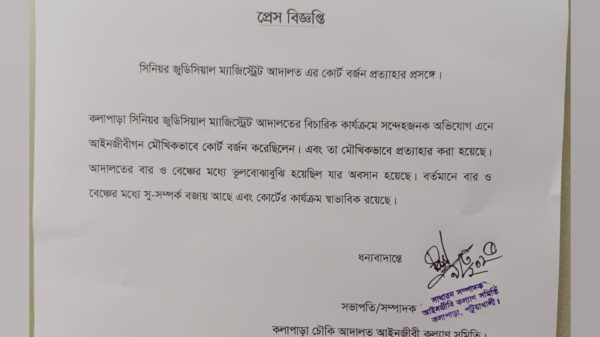 আপন নিউজ অফিসঃ কলাপাড়ায় সিনিয়র জুডিসিয়াল ম্যাজিস্ট্রেট আদালতে আইনজীবীদের কোর্ট বর্জনের সিদ্ধান্ত প্রত্যাহার করা হয়েছে। এক প্রেস বিজ্ঞপ্তির মাধ্যমে বিষয়টি নিশ্চিত করেন কলাপাড়া চৌকি আদালত আইনজীবী কল্যাণ সমিতির সাধারণ সম্পাদক আরও পড়ুন