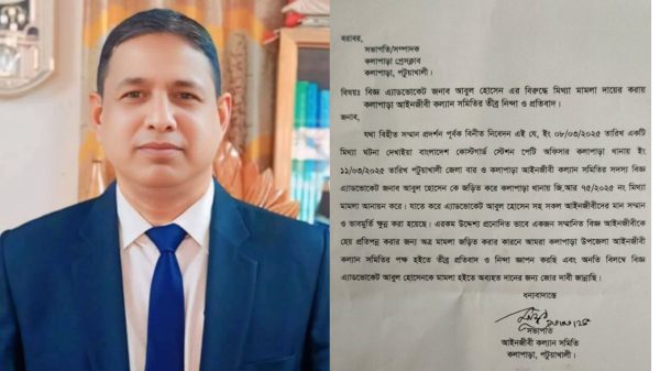 আপন নিউজ অফিসঃ কলাপাড়া আইনজীবী কল্যাণ সমিতি বিজ্ঞ এ্যাডভোকেট আবুল হোসেনের বিরুদ্ধে দায়ের করা মিথ্যা মামলার তীব্র নিন্দা ও প্রতিবাদ জানিয়েছে। বৃহস্পতিবার (১৩ মার্চ) কলাপাড়া আইনজীবী কল্যাণ সমিতির সভাপতি অ্যাডভোকেট আরও পড়ুন