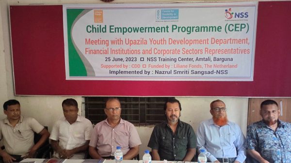আমতলী প্রতিনিধিঃ বে-সরকারী সংস্থা এনএসএস ও চাইল্ড এ্যামপাওয়ারমেন্ট প্রোগ্রামের উদ্যোগে সিডিবির অর্থায়নে প্রতিবন্ধিদের সাথে সংযোগ বিষয়ক কর্মশাল অনুষ্ঠিত হয়েছে। রবিবার এনএসএস’র টেনিং সেন্টারে এ কর্মশালা অনুষ্ঠিত হয়। এনএসএস নির্বাাহী পরিচালক আরও পড়ুন