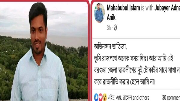 আমতলী প্রতিনিধিঃ সাংগঠনিক নির্দেশনা না মানায় বাংলাদেশ ছাত্রলীগ আমতলী উপজেলা শাখার সভাপতি মো. মাহবুবুল ইসলামকে সভাপতির পদ থেকে অব্যাহতি দিয়েছে বরগুনা জেলা ছাত্রলীগ । অব্যাহতি দেয়ায় সামাজিক যোগাযোগ মাধ্যমে তাদের আরও পড়ুন