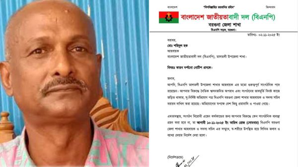 আমতলী প্রতিনিধিঃ বরগুনার তালতলী উপজেলা বিএনপির আহবায়ক শহীদুল হকের বিরুদ্ধে নৈতিক স্খলন ও দলের ভাবমূর্তি ক্ষুণ্ণ করার অভিযোগে কারণ দর্শানোর নোটিশ দেয়া হয়েছে। রবিবার বিকেলে বরগুনা জেলা বিএনপি সদস্য সচিব আরও পড়ুন