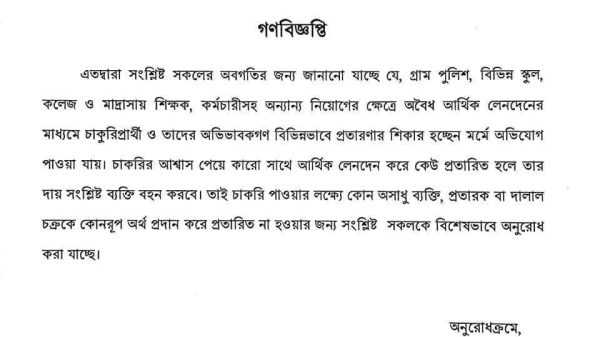 আমতলী প্রতিনিধিঃ গ্রাম পুলিশ, বে-সরকারী স্কুল কলেজ ও মাদ্রাসায় নিয়োগের নামে একটি প্রতারক চক্র চাকুরী প্রার্থীদের কাছ থেকে লক্ষ লক্ষ টাকা হাতিয়ে নিচ্ছে। এ প্রতারক চক্রের প্রতারনা থেকে সাধারণ মানুষকে আরও পড়ুন